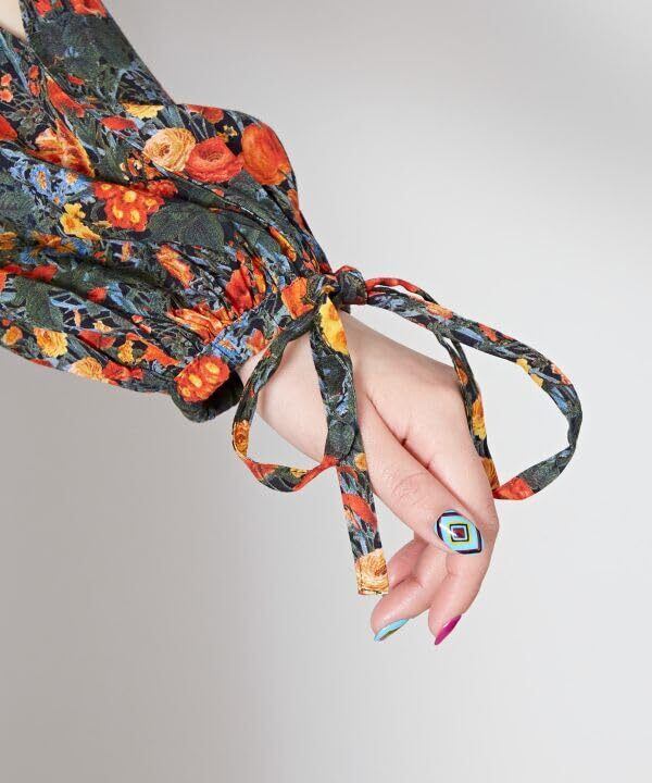 花々が咲き誇る美しいフランスの庭をイメージしたプリントワンピース。ボリュームのある袖に大胆に入ったスリットが印象的。胸元のタックと背中に入ったゴムで胸下が程よくフィットして綺麗なAラインに。ストンと落ち感のあるすっきりとしたシルエットながら生地が柔らかく、リラックス出来る軽やかな着心地です。サイドにポケットもあり。裾のスリットのおかげで動きやすく、袖とウエストのリボンづかいが女性らしいスタイルに仕上がります。マキシ丈なのでコーディネートなしで一枚でお洒落にご着用が可能です。
