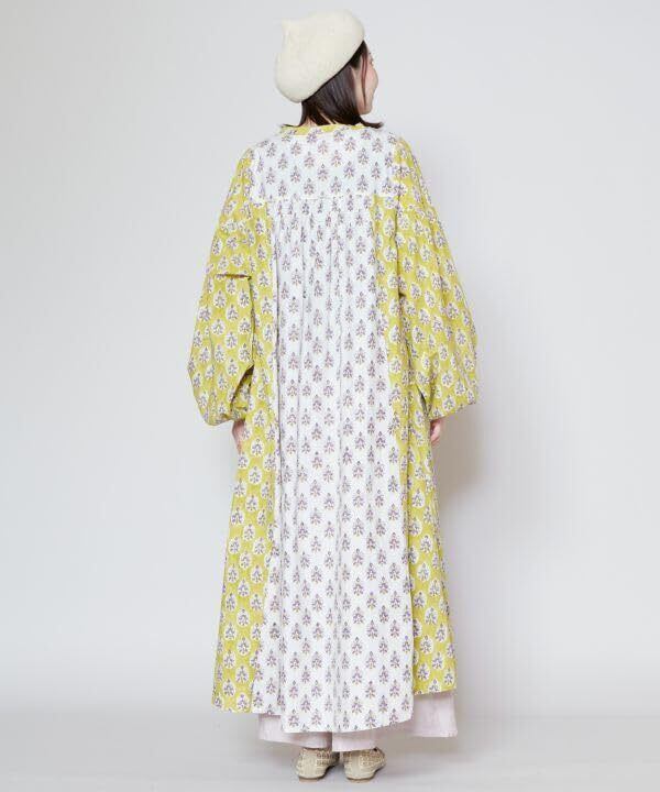ジャイプールの伝統工芸品、ブルーポタリーから着想を得たワンピース。タイプライターという、高密度でハリのある綿素材を使用しているのでモードできれいめなシルエットに仕上がる。袖部分とバックに施されたハンドスモッキングがポイント。