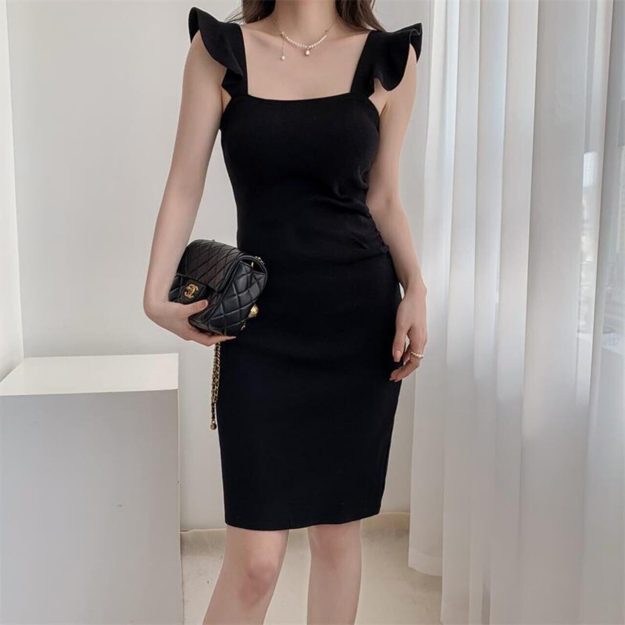 [Lady glamour] フレアー ストラップ ニット ワンピース くびれ ギャザー ひざ丈 ノースリーブ ワンピ レディース