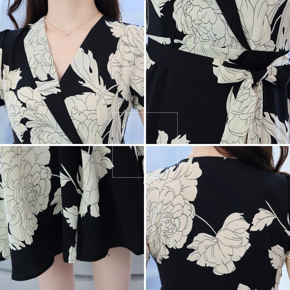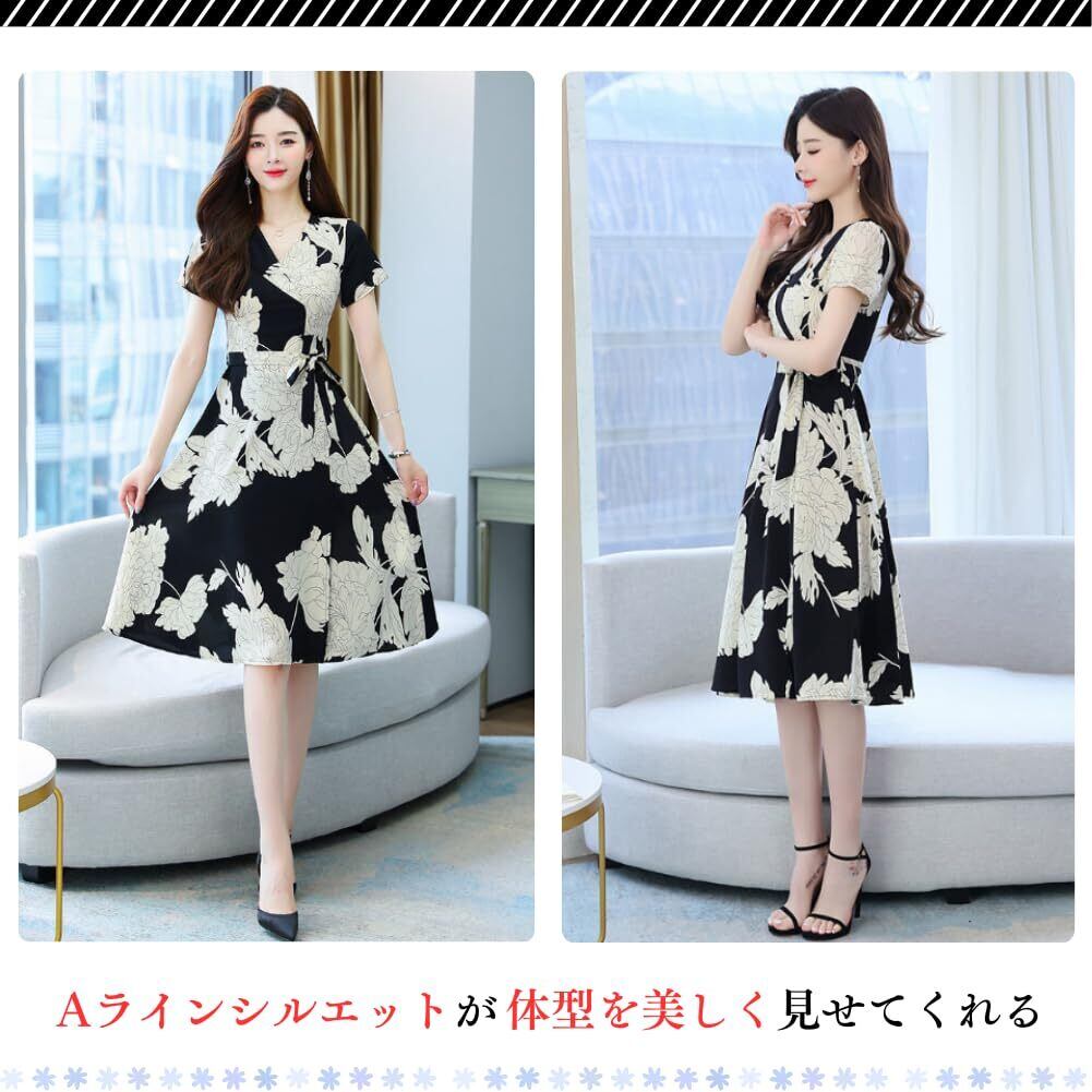 [UQQA] 【在庫限り】 大花柄 Vネック ワンピース レディース レトロ ウエストゴム ハーフスリーブ 春夏秋 マルチカラー