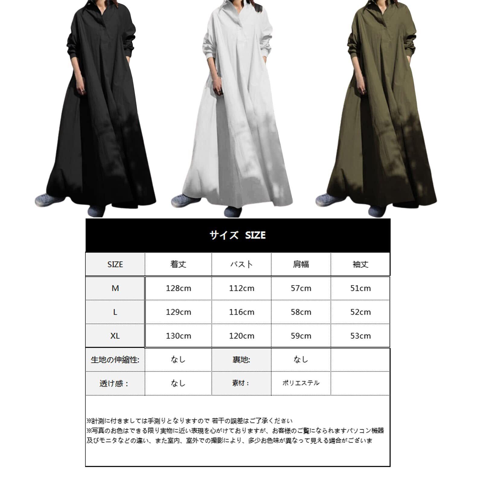 【秋服レディース ワンピースのサイズ】M:着丈128cm バスト:112cm 肩幅:57cm 袖丈:50cm / L:着丈129cm バスト:116cm 肩幅:58cm 袖丈:52cm XL:着丈130cm バスト:120cm 肩幅:59cm 袖丈:53cm。計測に付きましては手測りとなりますので 若干の誤差はご了承ください。普段ウェア、ブラウスとしてはもちろん、通勤シャツワンピース/オフィスワンピースとしても素敵!