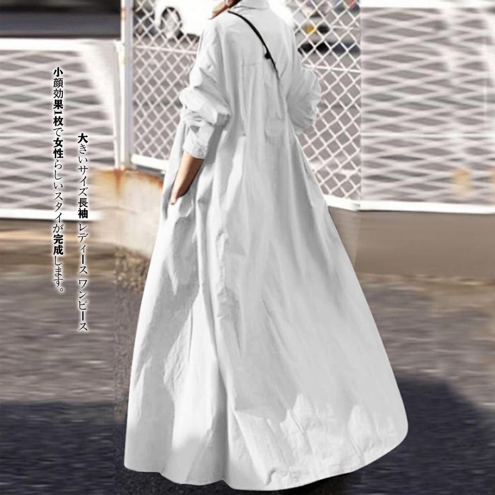 [7-livehouse] ワンピース レディース Vネック ロングワンピース 長袖 大きいサイズ シャツワンピース ゆったり 体型カバー 着痩せカジュアル 無地 ドレス レディース お出かけ 通勤 春秋