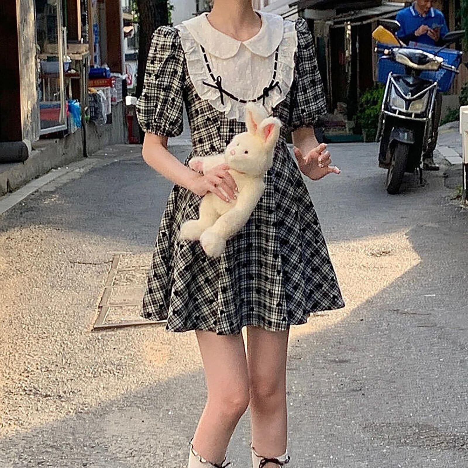 【特価セール】[LAVASEON] 量産型 可愛い ワンピース チェック柄 レディース 学院風 リボン ミニ レース ハート柄 パフスリーブ 地雷系 森ガール Aライン きれいめ ハイウエスト おしゃれ 夏 春秋 | BOSSO