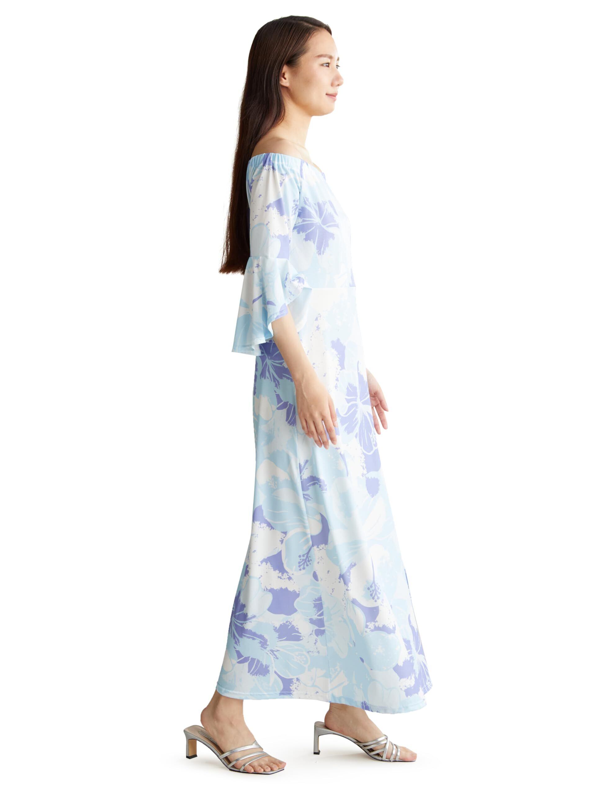 オンショルダー、オフショルダーでご着用いただけます。優雅に揺れる袖のベルスリーブが印象的でトレンド感あるデザイン。バスト下の高めの切替えでスタイルアップ。膝上までの程よいスリットが女性らしいスタイル。足下からの着脱が可能です。メイクやヘアスタイルを崩しません。「プアアロアロ」ビビッドカラーを効かせたダイナミックなハイビスカス(アロアロ)のアートワーク。幾重にも重ねた奥深い色層がポリネシアンムードを際立たせます。ヴィンテージ・ムウムウを想わせるノスタルジックさとトレンド感をミックスしたデザインに仕上げました