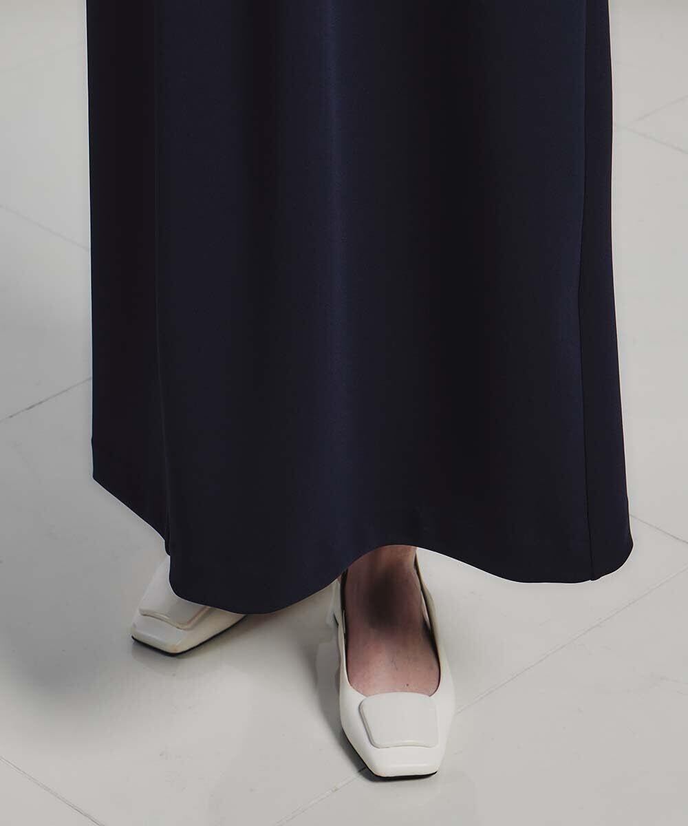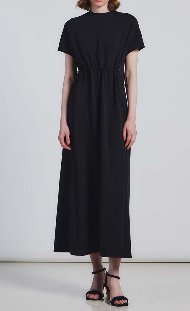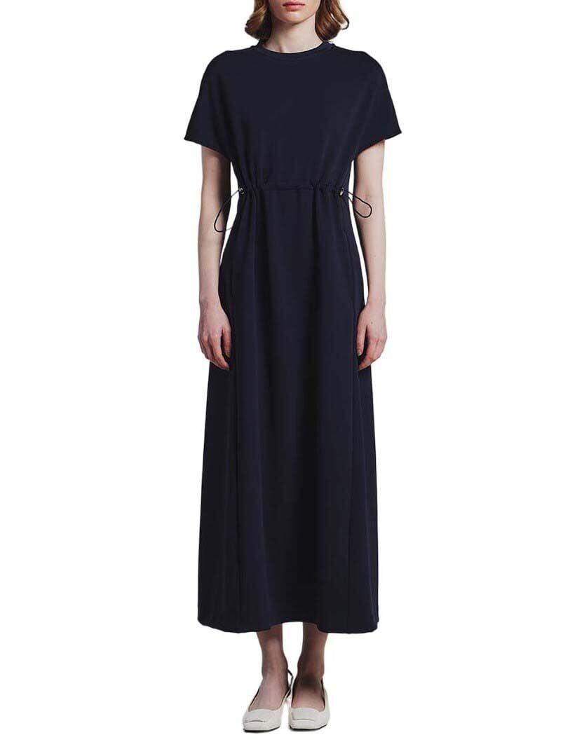 シックなカラーリングで作ったロング丈のワンピース。ウエスト部分がドロスト仕様になっており、ギャザーデザインがスポーティーなアクセントをプラスします。ストレッチ性があり、着心地は抜群。なめらかな表面感とほのかな光沢感が美しいダンボール生地のため、カジュアルながらもきれいめに着られるのが魅力です。パンプスからスニーカーまで、合わせるシューズ次第で雰囲気を変えられるアイテム。