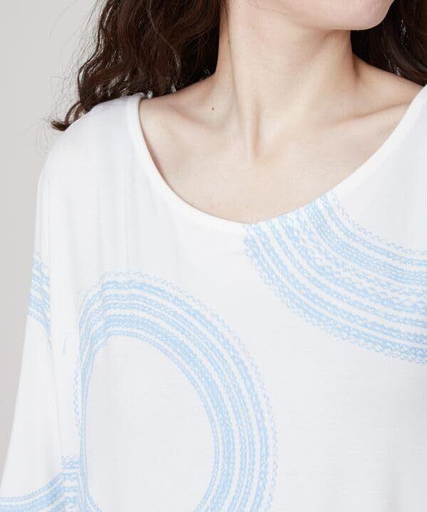 サークル状のクラシカルタパを大胆に配置し、リゾート感ある新鮮なイメージに。デコルテを美しく見せてくれるボートネックで、前後2wayで着用可能。ゆったりとしたドルマンスリーブは気になる二の腕もカバーしてくれます。レーヨン素材で落ち感が良く、伸縮性があるのでリラックスしつつも女性らしいラインの美しいシルエットです。