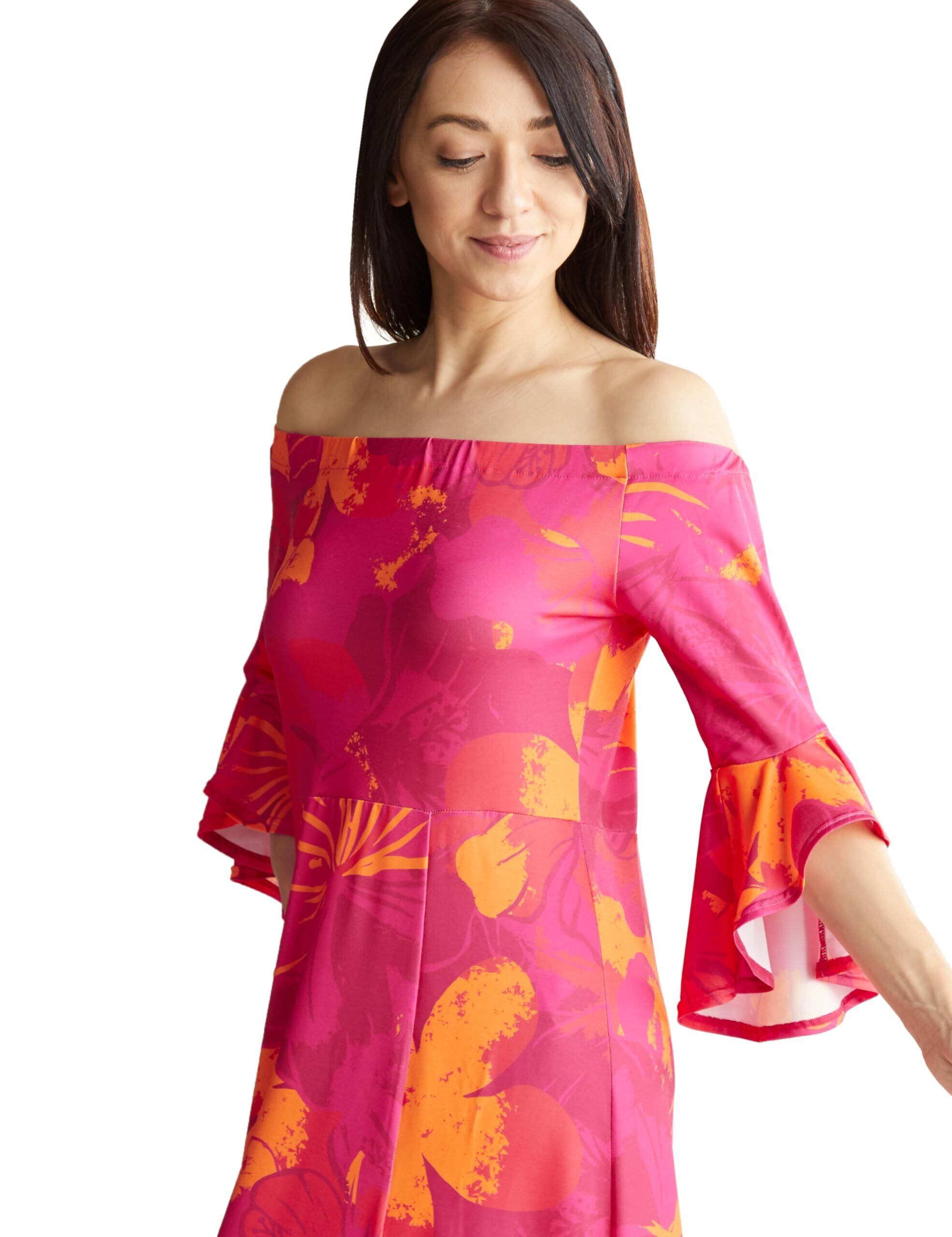 オンショルダー、オフショルダーでご着用いただけます。優雅に揺れる袖のベルスリーブが印象的でトレンド感あるデザイン。バスト下の高めの切替えでスタイルアップ。膝上までの程よいスリットが女性らしいスタイル。足下からの着脱が可能です。メイクやヘアスタイルを崩しません。「プアアロアロ」ビビッドカラーを効かせたダイナミックなハイビスカス(アロアロ)のアートワーク。幾重にも重ねた奥深い色層がポリネシアンムードを際立たせます。ヴィンテージ・ムウムウを想わせるノスタルジックさとトレンド感をミックスしたデザインに仕上げました