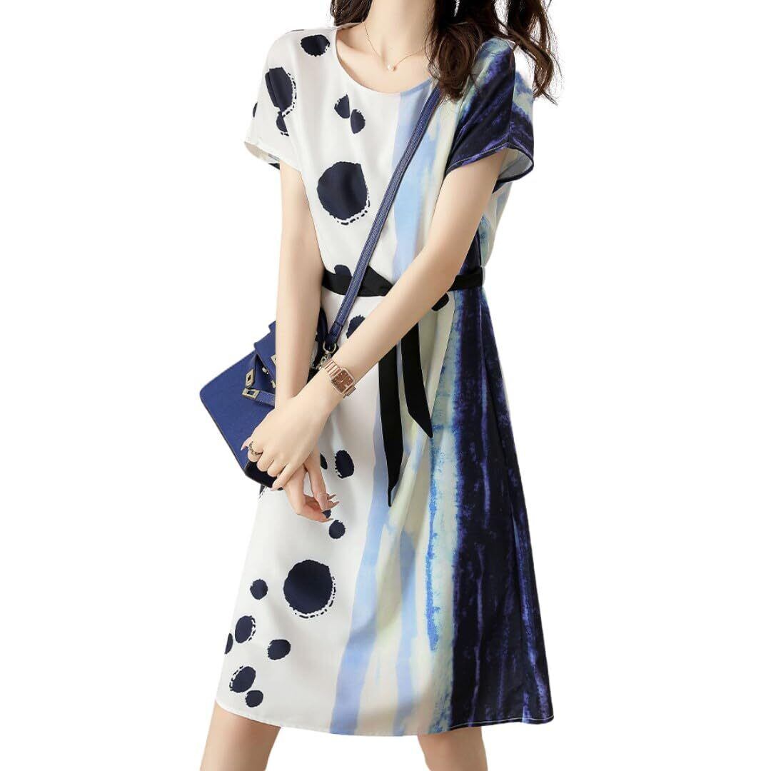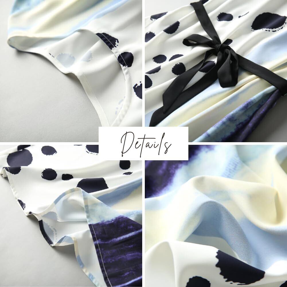 日常に洗練されたスタイルをもたらします シンプルながらも印象的なカジュアルデザインで、パステルカラーがあらゆるシーンにマッチする万能アイテムです。 ホワイトをベースに、ブルーとブラックの大胆な模様があしらわれています。 ドット柄とストライプが組み合わされたデザインは、魅力的でありながら上品さを失いません! クルーネックと短めの袖口はシンプルでありどんな体型の方にもフィットしやすい設計です。 ウエスト部分にはブラックの細ベルトがついており、スタイルアップ効果も期待できます。 着る人の魅力を最大限に引き立てます。