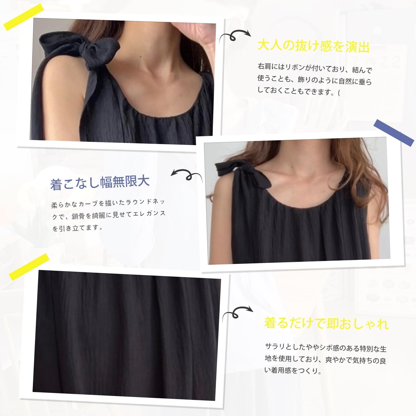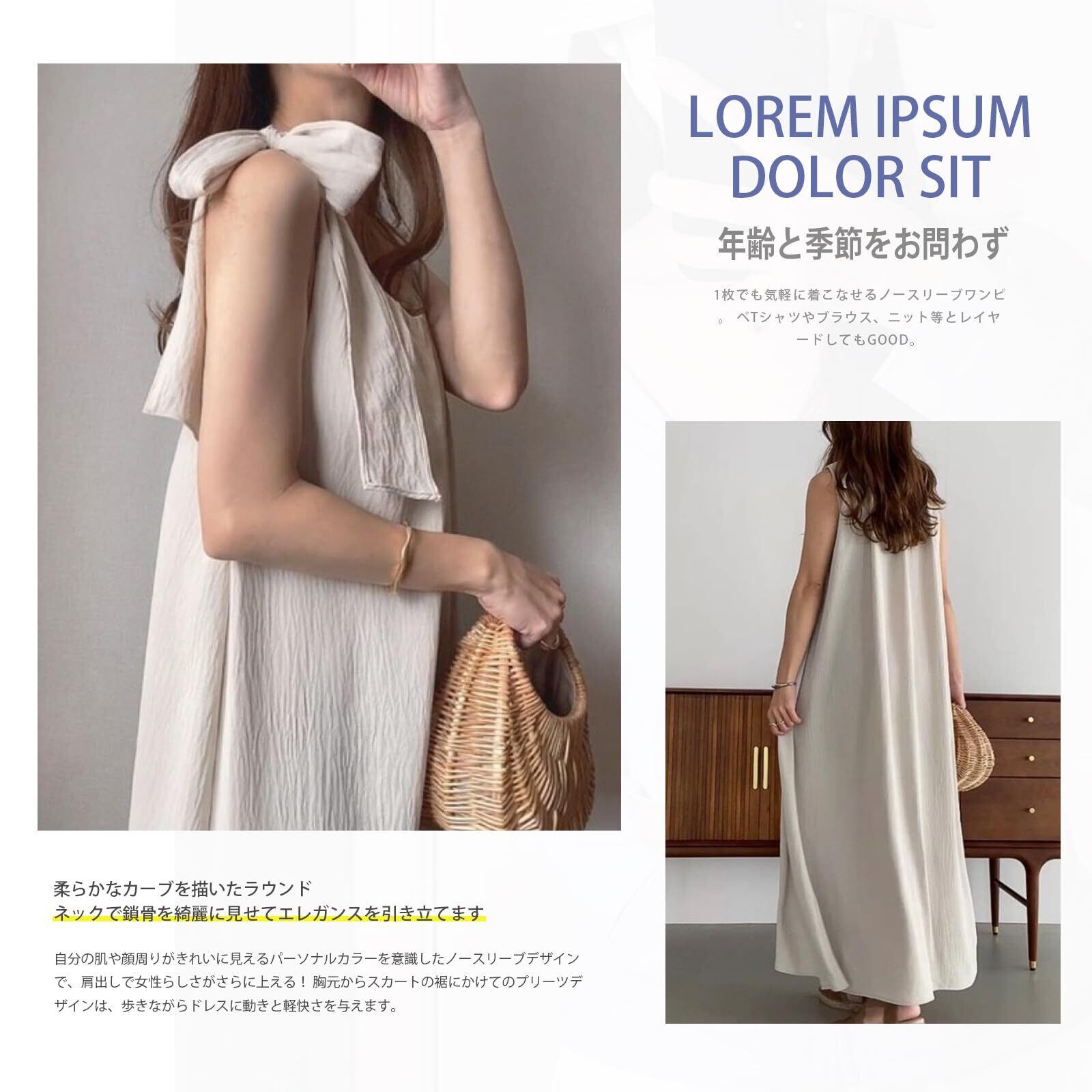 【気楽にお洒落感がアップ】右肩にはリボンが付いており、結んで使うことも、飾りのように自然に垂らしておくこともできて、上品なイメージを演出。柔らかなカーブを描いたラウンドネックで鎖骨を綺麗に見せてエレガンスを引き立てます。自分の肌や顔周りがきれいに見えるパーソナルカラーを意識したノースリーブデザインで、肩出しで女性らしさがさらに上える! 胸元からスカートの裾にかけてのプリーツデザインは、歩きながらドレスに動きと軽快さを与えます。