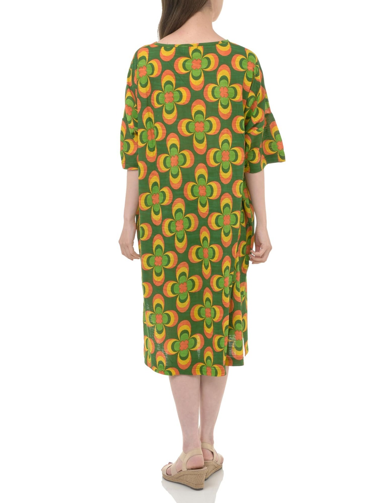 レトロなヒッピー柄のワンピース。綿スラブジャージ素材で着心地抜群。オーバーサイズ感がサイズレスに着られる。カジュアルな装いにも合うコーディネートを選ばないアイテム。