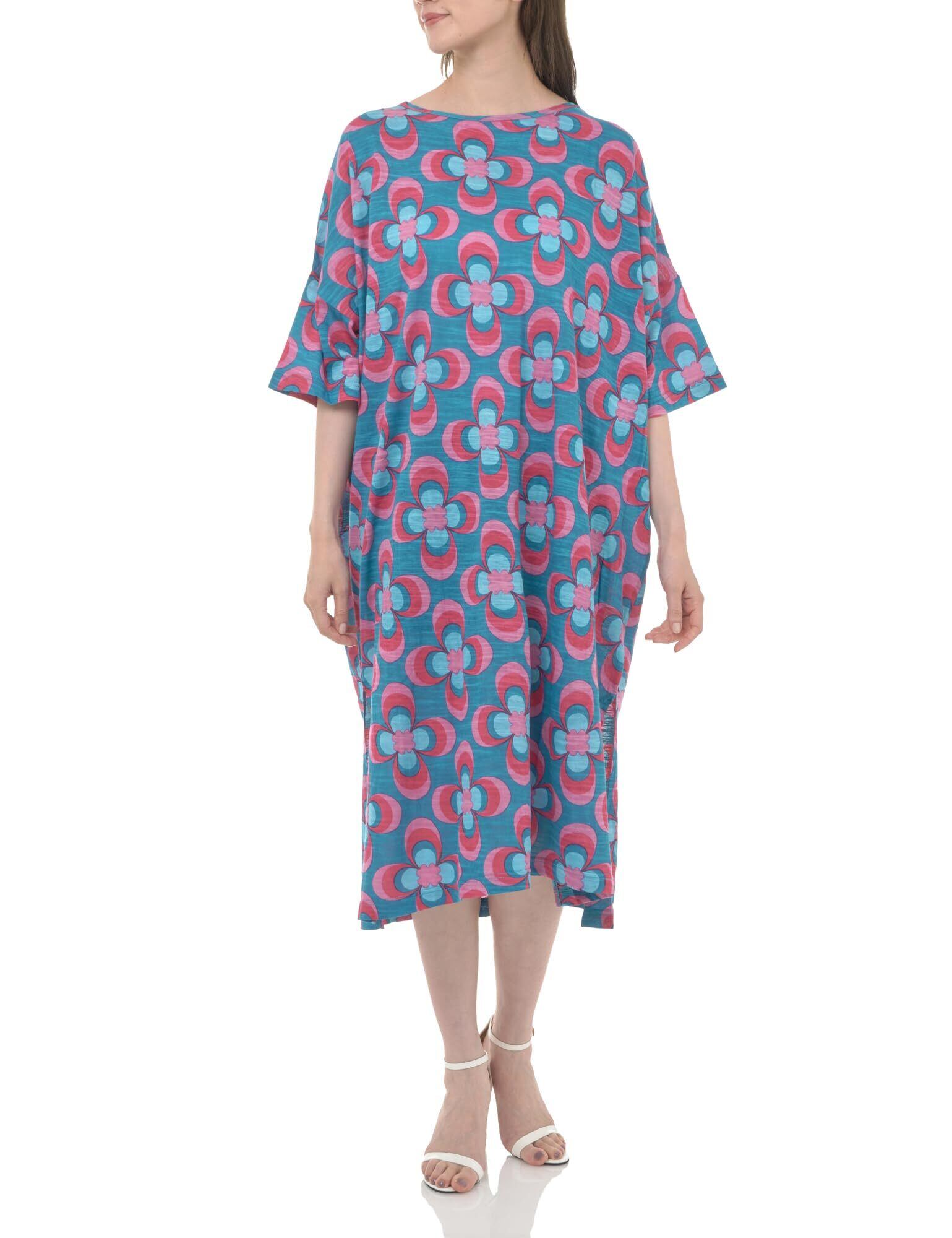 レトロなヒッピー柄のワンピース。綿スラブジャージ素材で着心地抜群。オーバーサイズ感がサイズレスに着られる。カジュアルな装いにも合うコーディネートを選ばないアイテム。