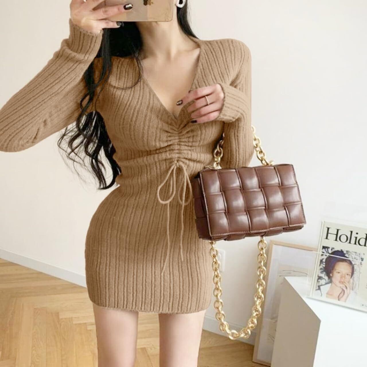 ■首元を女性らしく美しく魅せるVネックと、絶妙なバランスのミニ丈が大人の雰囲気を醸し出す、フェミニンでセクシーなニットミニワンピースです。