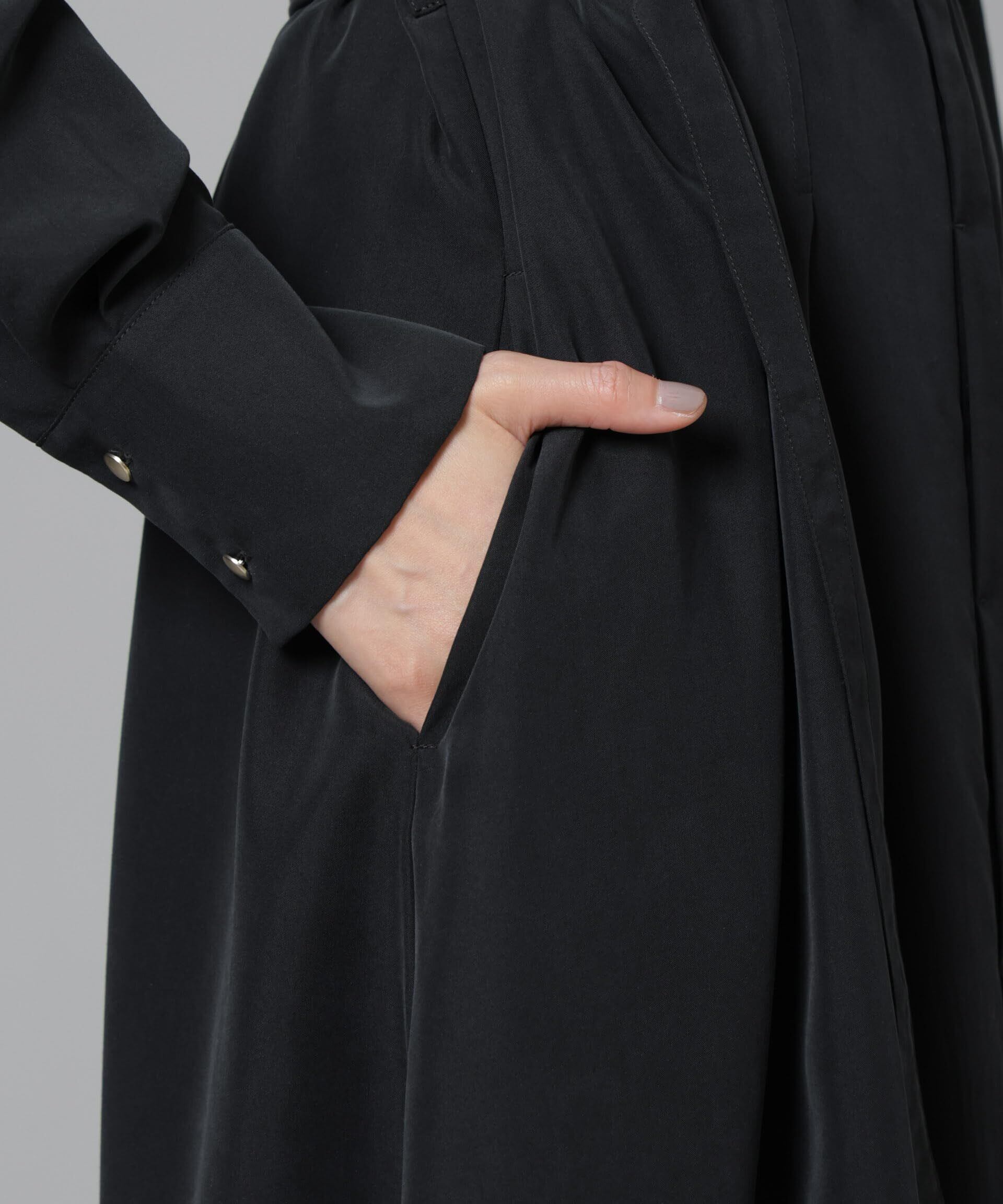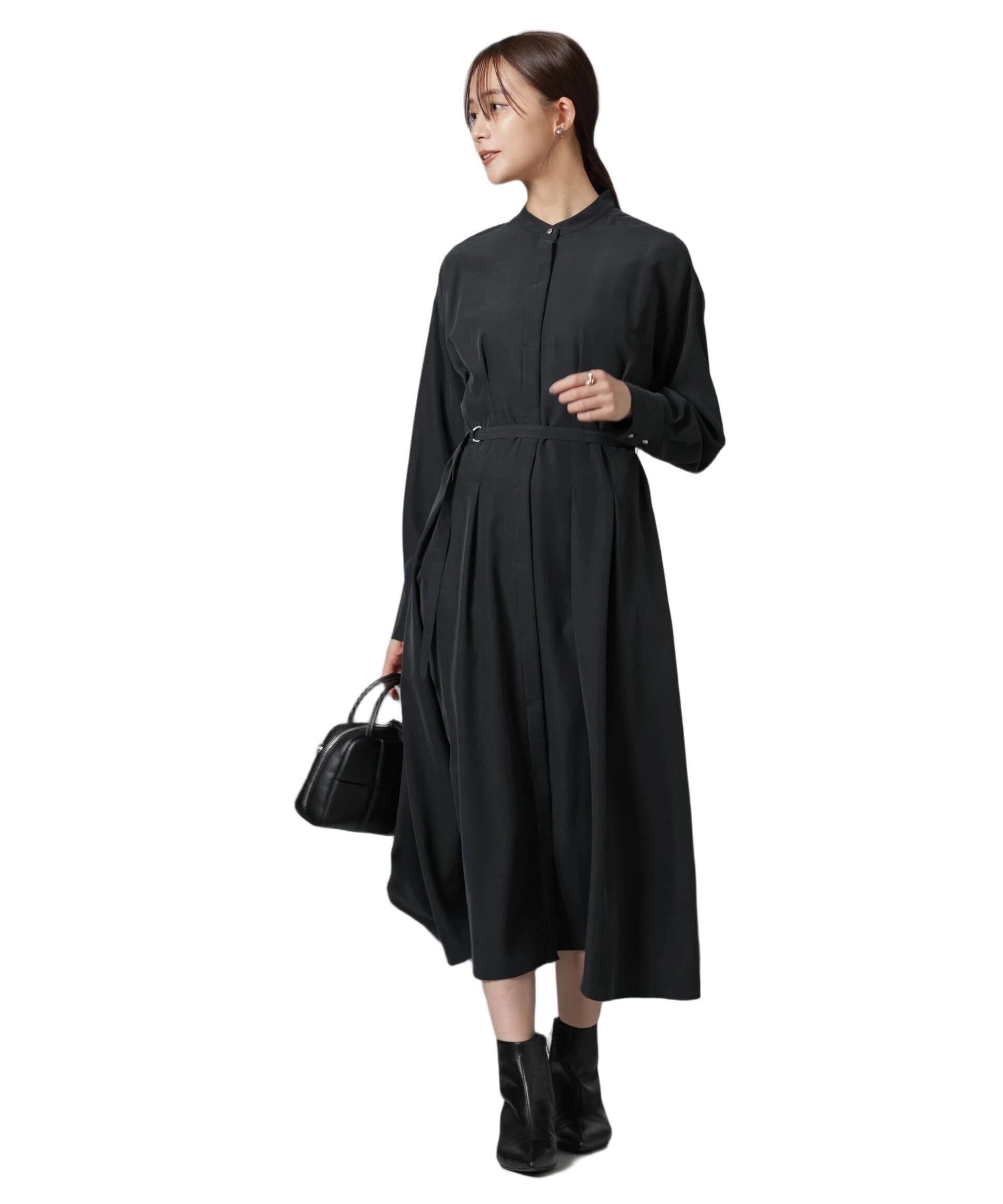 秋らしい素材感のスタンドカラーのベルト付きシャツ型ワンピース。ウエストは中縫いタックで程よくすっきり見えるようにシェイプされ、共生地の細ベルトでウエストマークで決まるきれいめなデザインです。