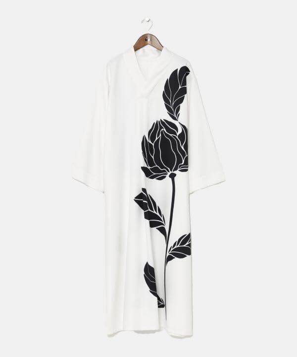 一輪の花のモチーフを大胆にデザインしたワンピース。シンプルながらインパクトのあるデザインで、同じシリーズの羽織りと合わせてセットアップとして着用するのもおすすめ。皺になりにくい素材とゆったりとしたシルエットで着心地が良く、着物のような合わせ衿で、気軽に和の要素を取り入れられます。両サイドポケット付き。