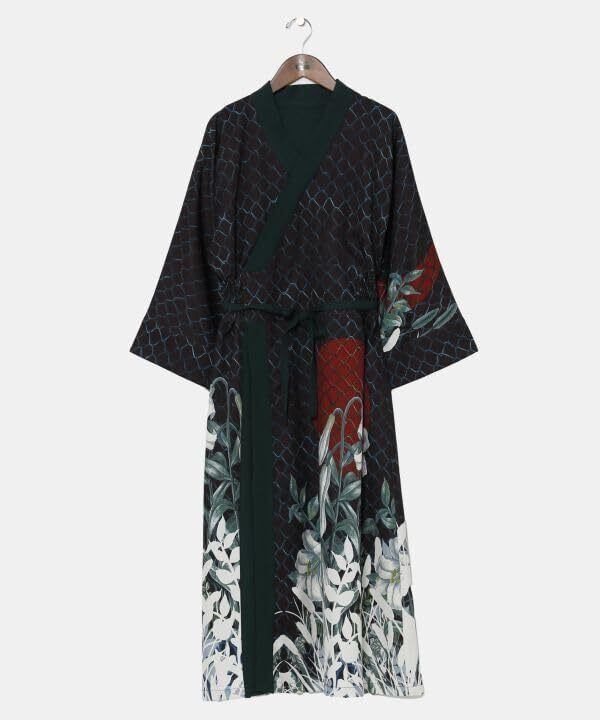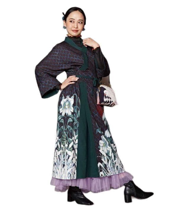 着物・オブジェ作家「重宗玉緒」とのコラボ商品。まるで着物のようなシルエットのワンピース。帯ベルトを合わせると、より和装の雰囲気を味わうことができます。●着物・オブジェ作家「重宗玉緒」メインテーマ「メメントモリ(死を想え)」に沿った、絵画のような着物や帯・オブジェを制作する他、作家自身が欲しいと思うファッションとして先鋭的なアイテムを、完全オリジナル、他にはない物作りにこだわって制作。英国立博物館に作品が永年収蔵され、海外でも展示会やビジュアル撮影を行うなど幅広く活動している。
