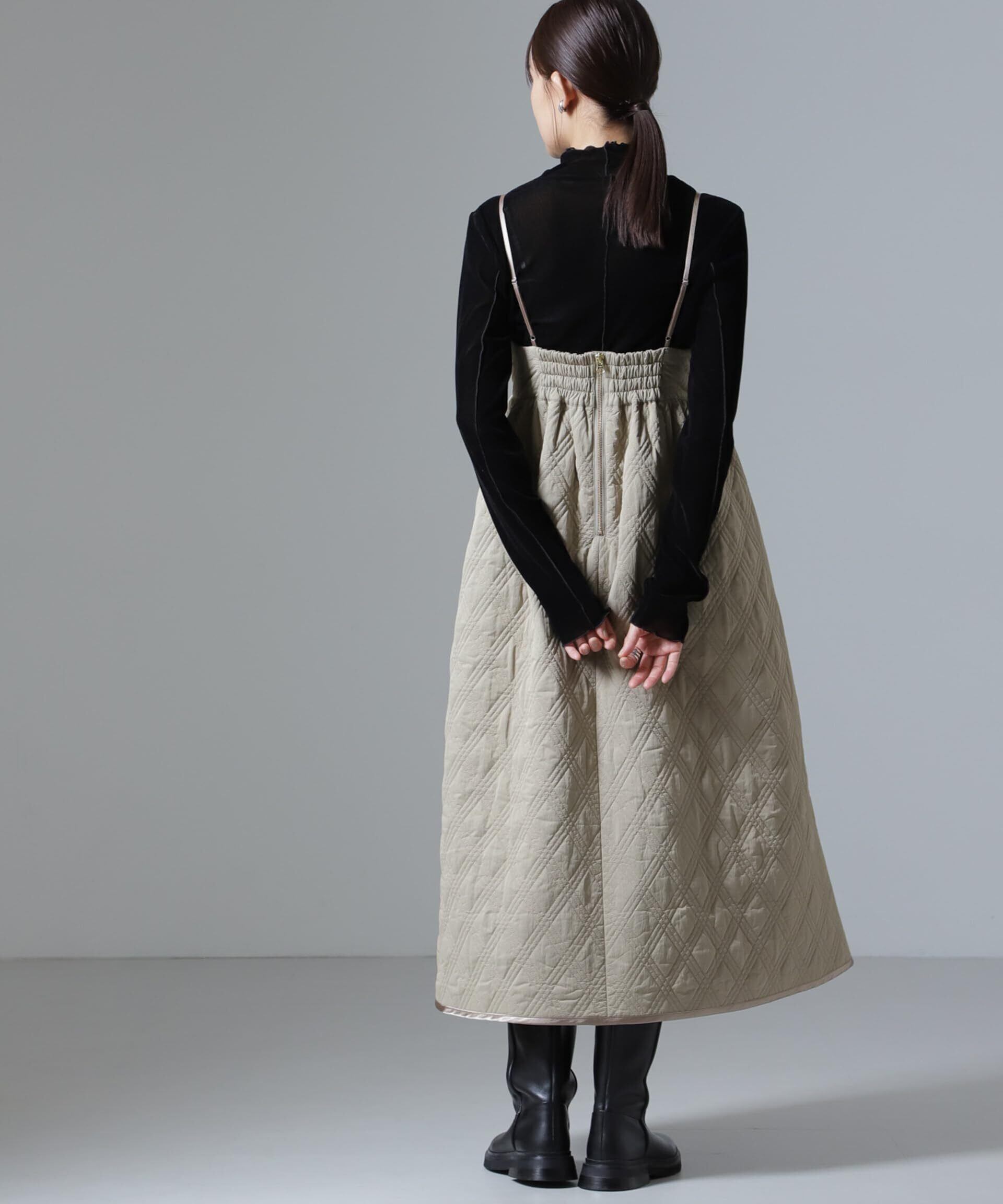 中綿キルトのふっくらとしたフォルムが特徴のキャミワンピース。全面に施されたオリジナルの変形ダイヤ柄がポイント◎リブニットやロンTをインナーに、トレンド感のあるスタイリングが完成します。
