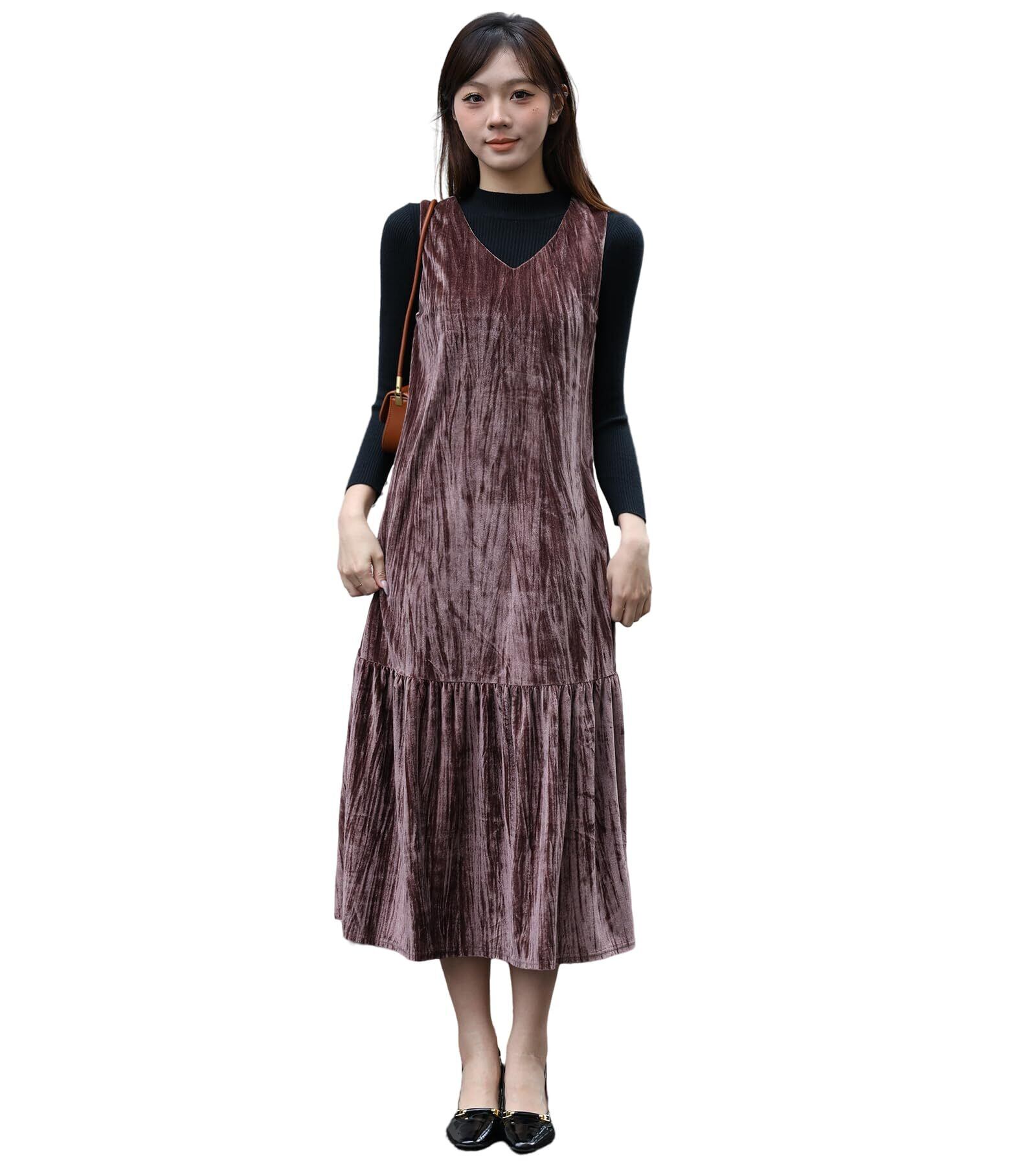 ●ベルベット素材のロングワンピースは、明暗が交互に入れ替わる光沢感があり、他のドレスとは違ってキラキラしていてラグジュアリー。結婚式や宴会などのフォーマルな場所に適しているだけでなく、軽いA字形のデザインのため、異なるコートを組み合わせ、日常着として、街を歩いても優雅で美しく見えます。