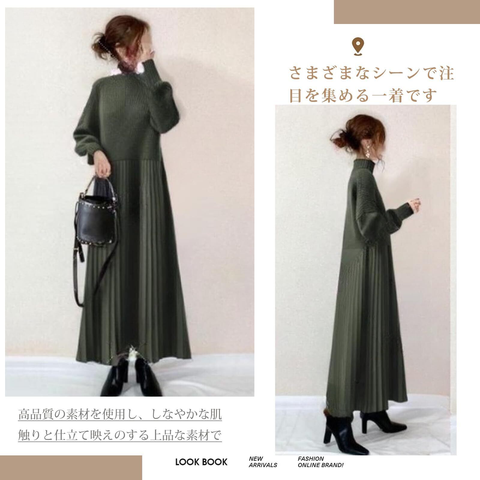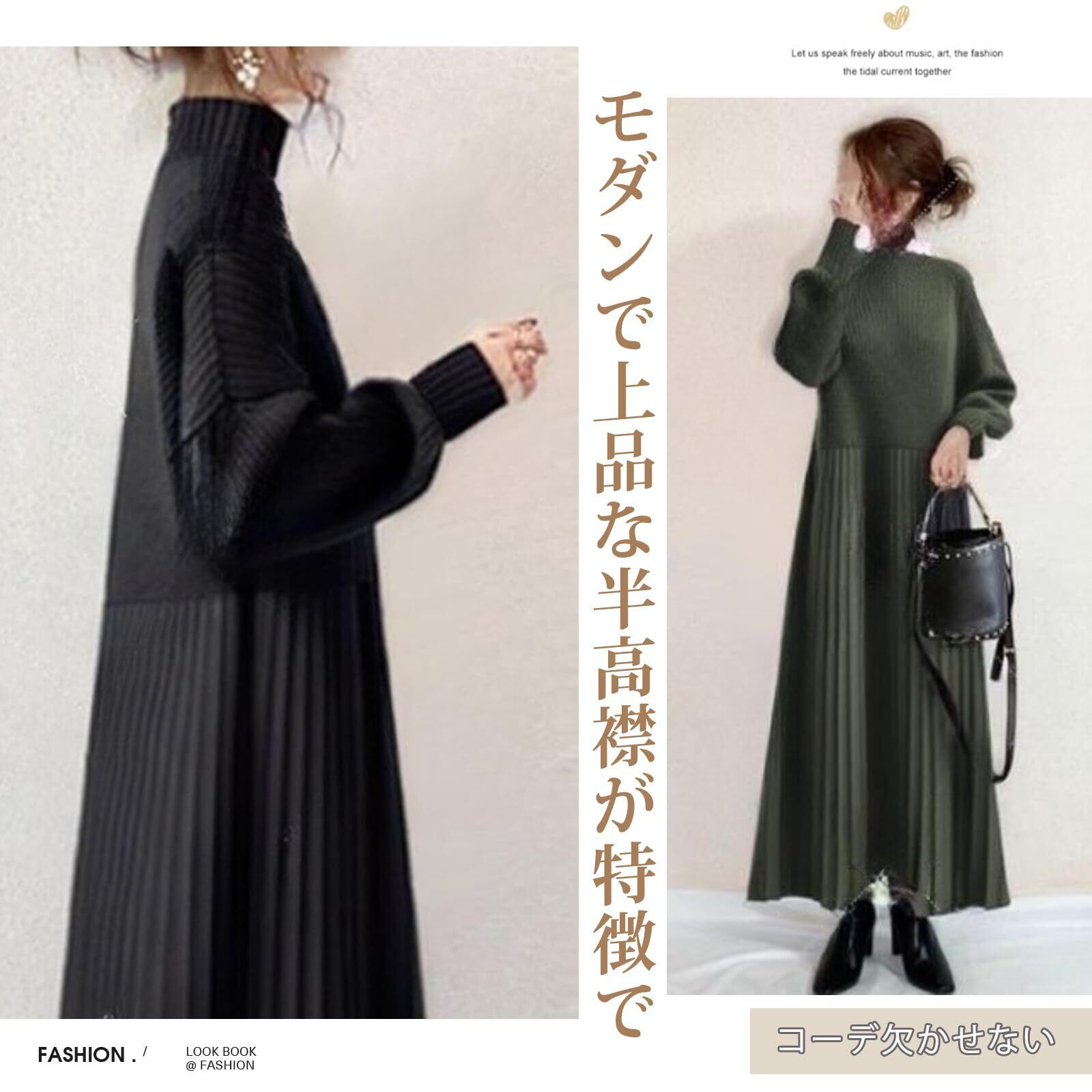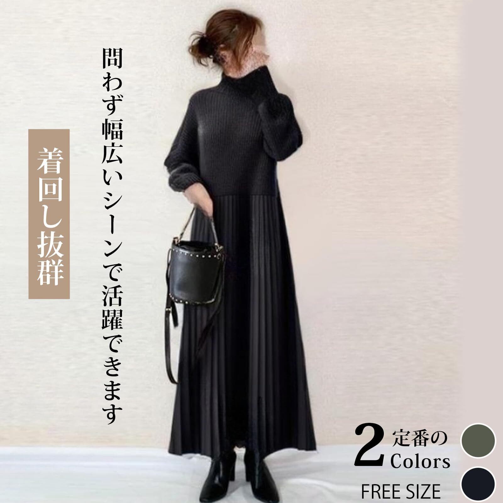 [NONELECEDOLE] ワンピース レディース ロングワンピース プリーツワンピース ニットワンピース ハイネック 切り替え 無地 フリル 長袖 体型カバー 可愛い おしゃれ 快適 お出かけ 通勤 レトロ 春 秋 冬