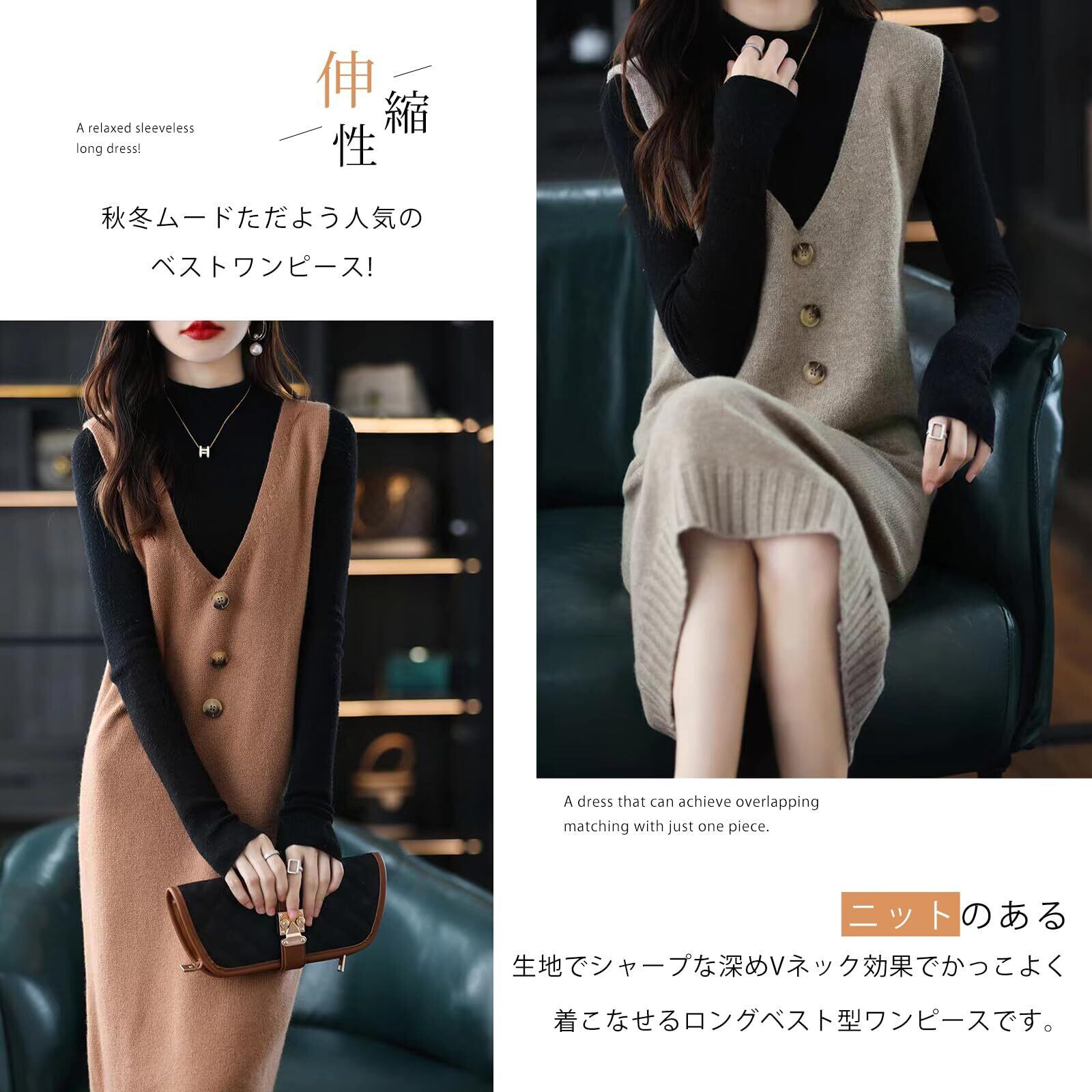 【新着商品】[7-livehouse] ニットワンピース レディース ノースリーブ ニットベスト ロングワンピース セーターワンピース ジャンパースカート Vネック 無地 重ね着 上品 着痩せ 体型カバー お出かけ カジュアル 春 秋 冬 | BOSSO
