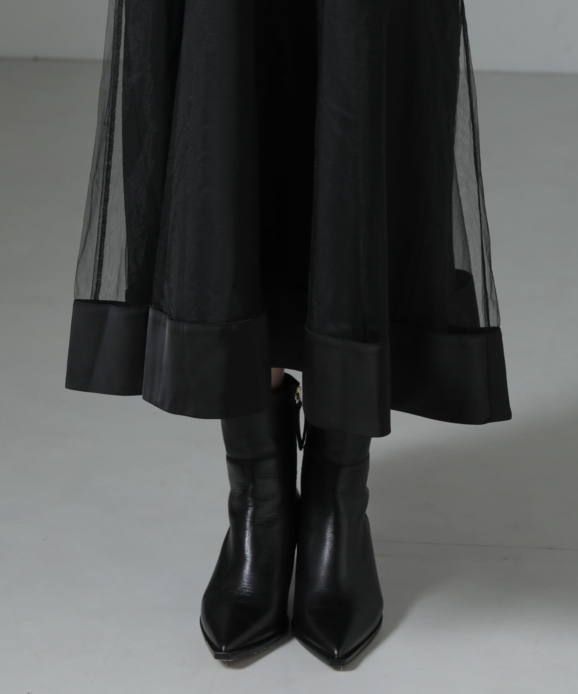 ・チュールスカートの裾にサテン生地を接ぎ、ハリ感のあるフレアシルエットに◎