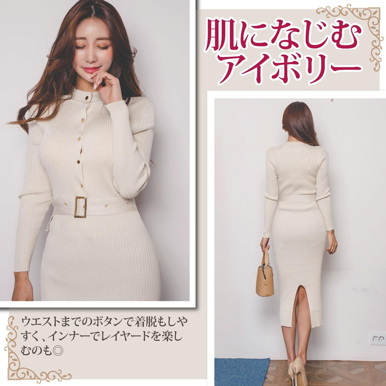 ハイネックリブニットタイトワンピース(キャバドレス・CABARETDRESS)。ゴールドボタンがアクセントの伸縮性のあるリブニットがボディラインを強調し、女性らしい色気を演出。ウエストまでのボタンで着脱もしやすく、インナーでレイヤードを楽しむのも◎セクシーなバックスリットで動きやすく、肌になじむアイボリーが美しい1着です