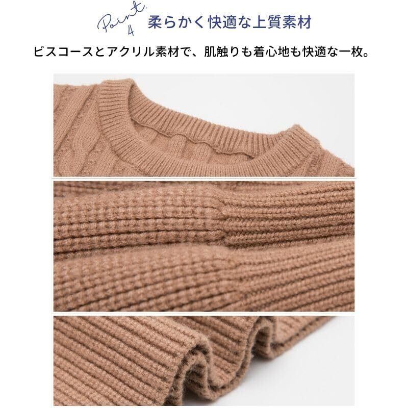 【女性らしさを引き立てるケーブル編みデザイン】繊細なケーブル編みが上半身を美しく引き立て、エレガントな雰囲気を演出します。立体感のある編み目がシンプルなデザインにアクセントを加え、秋冬にぴったりの華やかな印象をプラスします。
