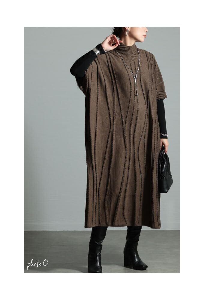 【特価セール】[sawa á la mode] 流れる ケーブル模様 ハイネック ニット チュニック レディース ファッション チュニック ニット ケーブル ライン 立体 半袖 ハイネック ミモレ 秋 冬 大人可愛い | BOSSO
