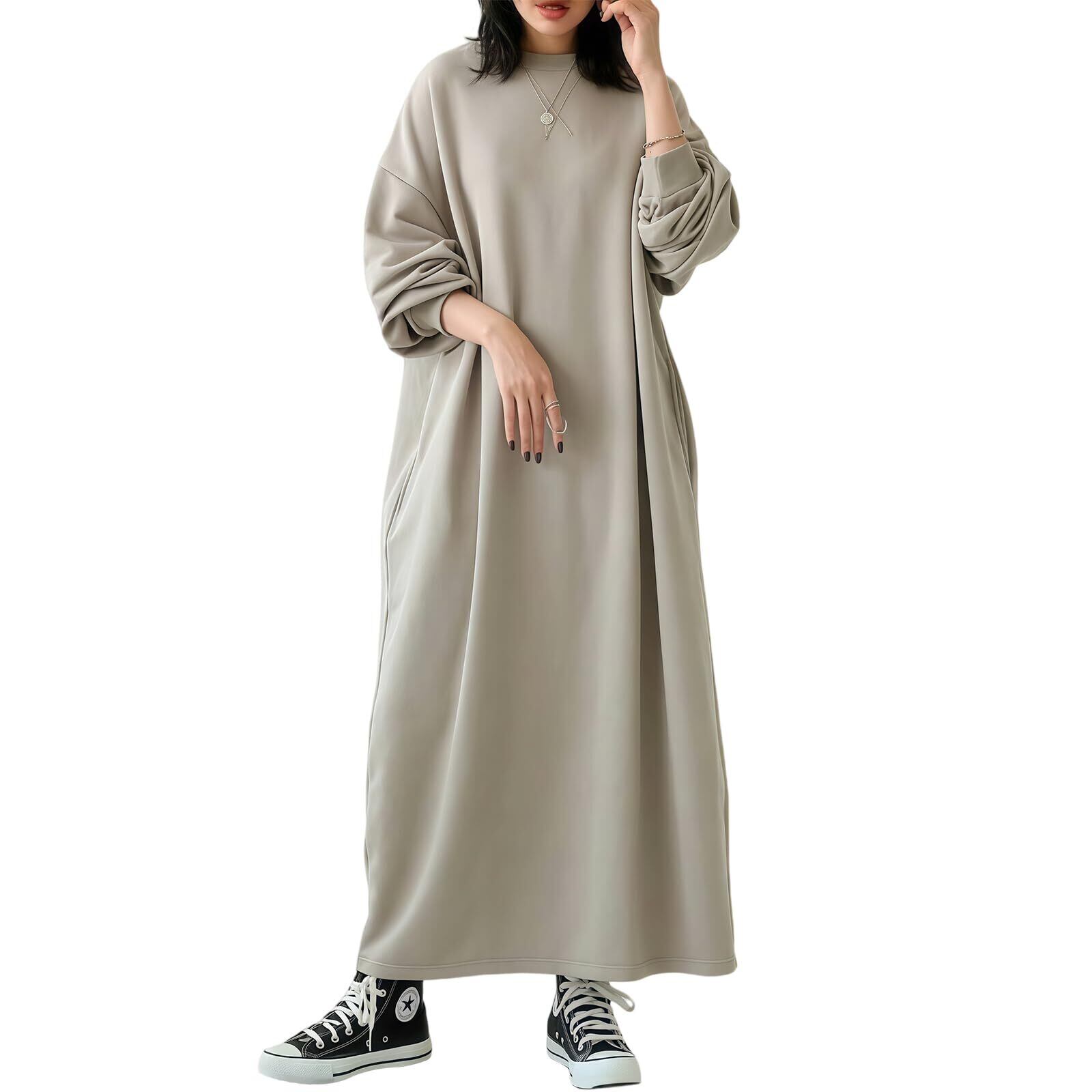 [DayaEmmoTQ] ワンピース レディース Hシルエット マキシワンピース 膝丈 ポケット付き 長袖 マキシ丈 無地 トップス ふんわり 大きいサイズ ゆったり カットソー 着痩せ オフィス 体型カバー 通勤 普段着 秋冬春 三色展開