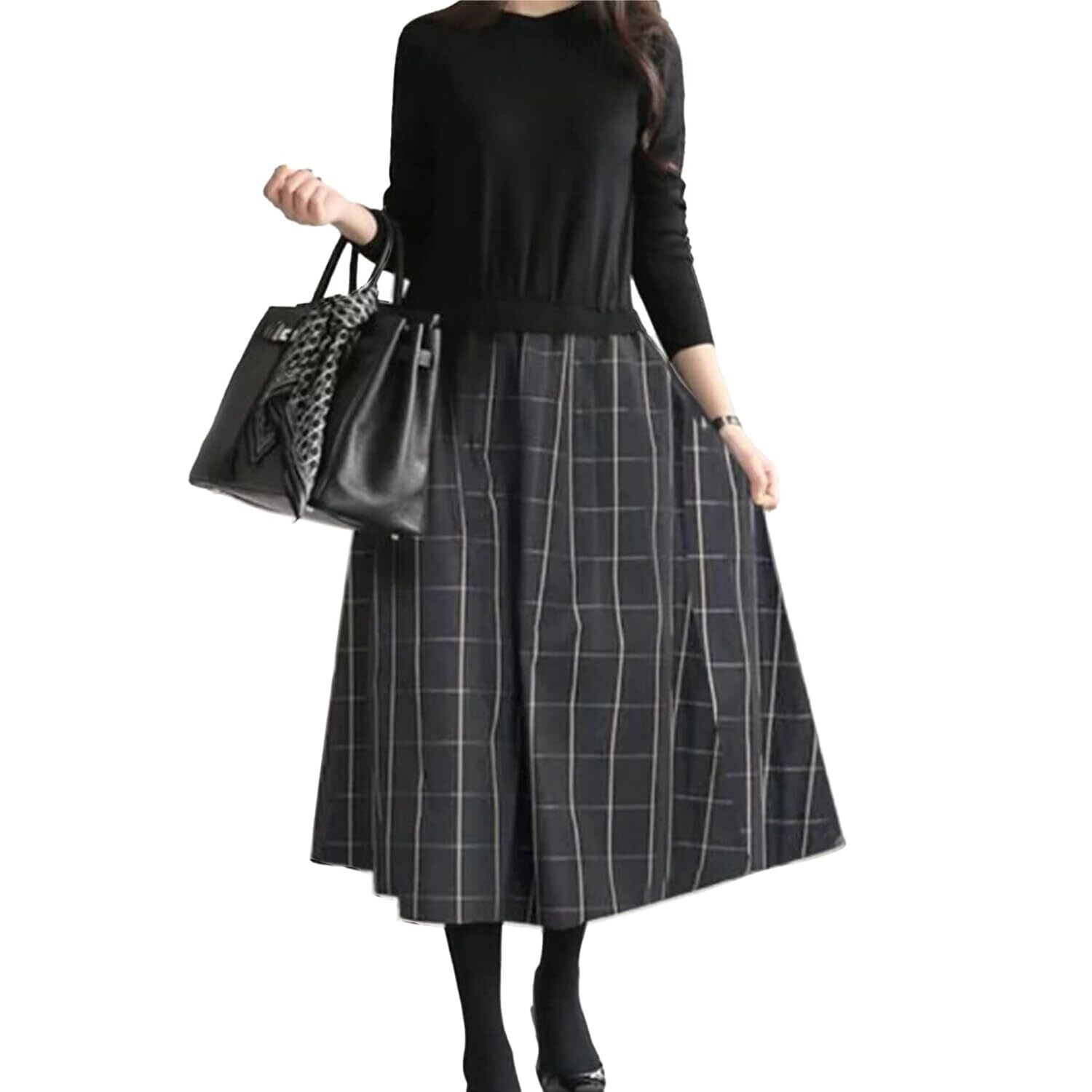 [M&Y FASHION] スプライスドレス女性春と秋の長袖セータードレスカジュアルエレガントブラックスプライスグレーチェック柄フリーサイズ