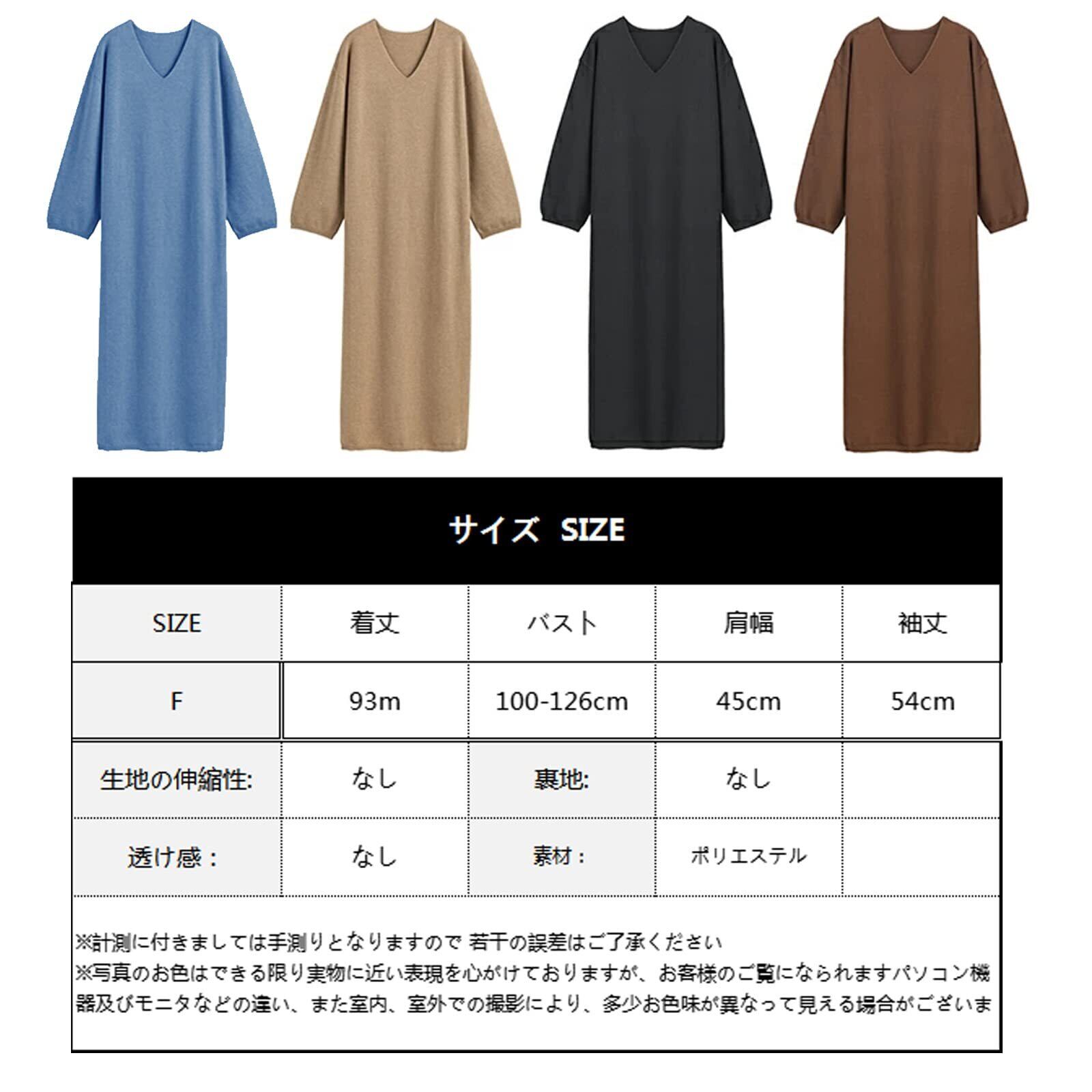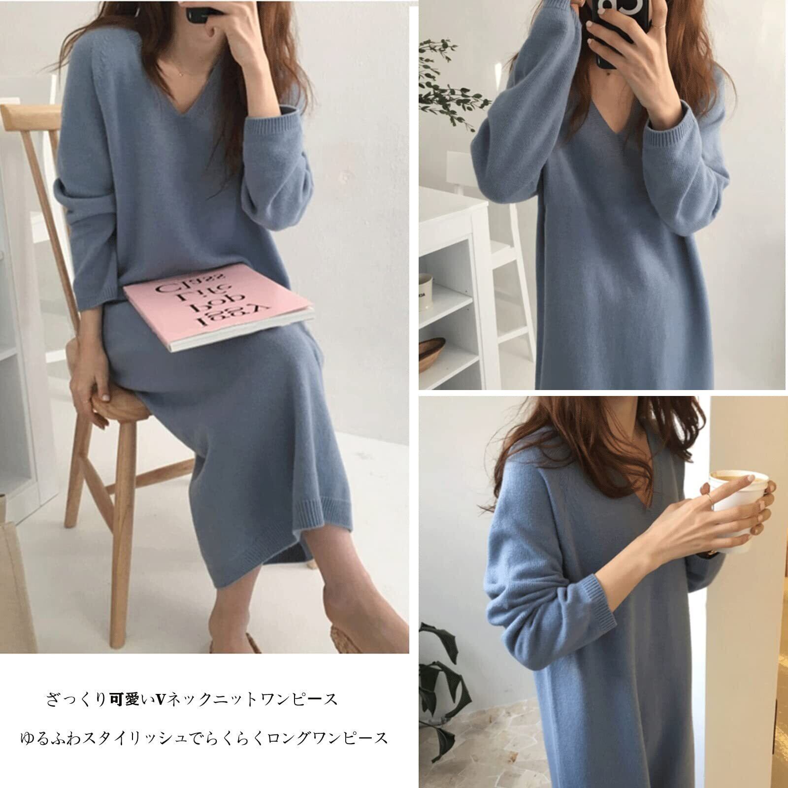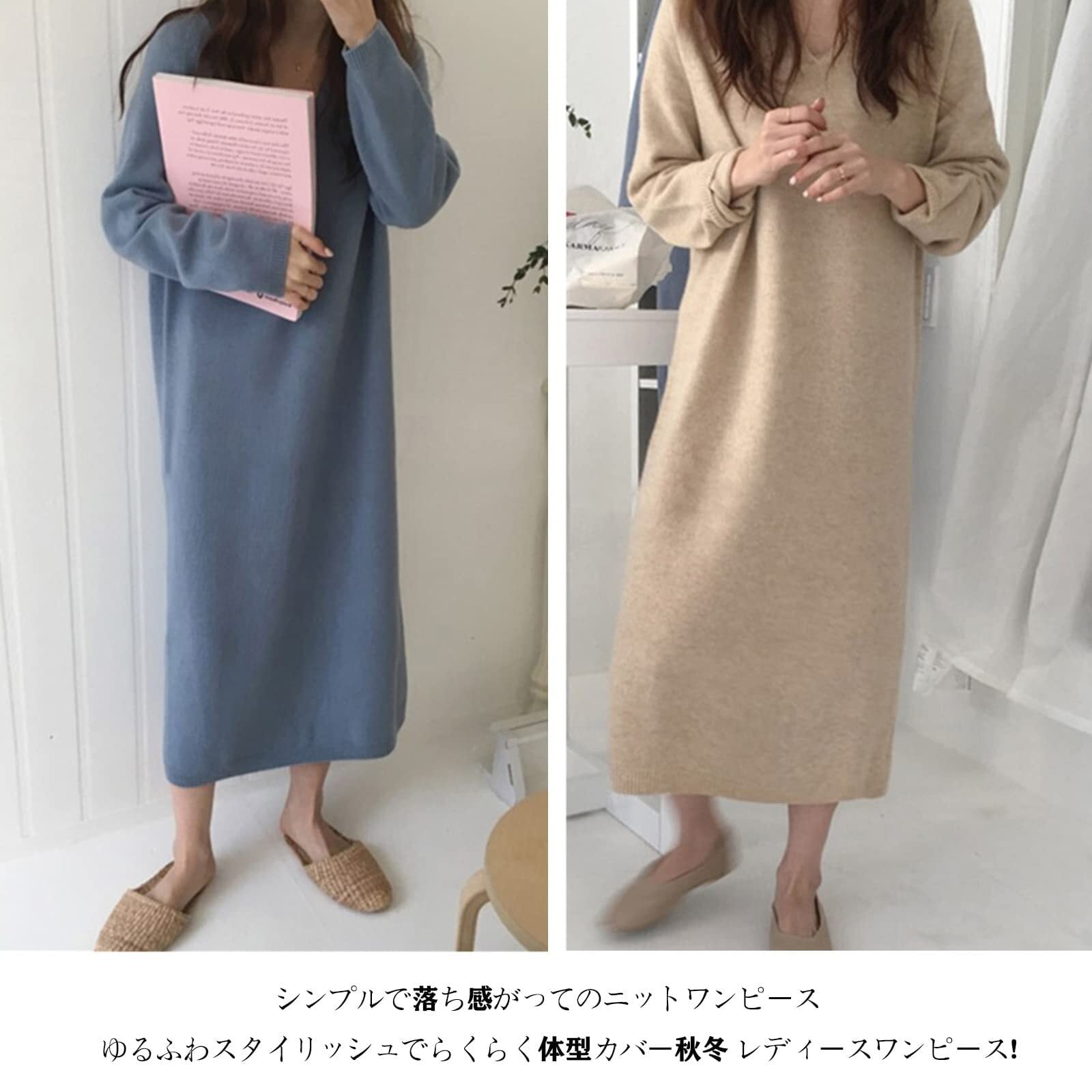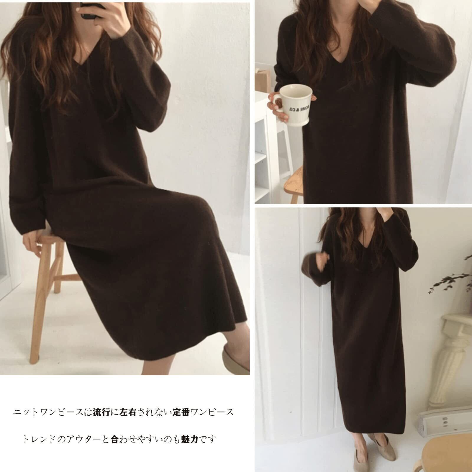 [7-livehouse] ニットワンピース レディース ニット ロングワンピース Vネック 無地 大きいサイズ ゆったり 体型カバー 着痩せ 大人 可愛い 抜け感 お洒落 きれいめ 保温 通勤 秋 冬 春