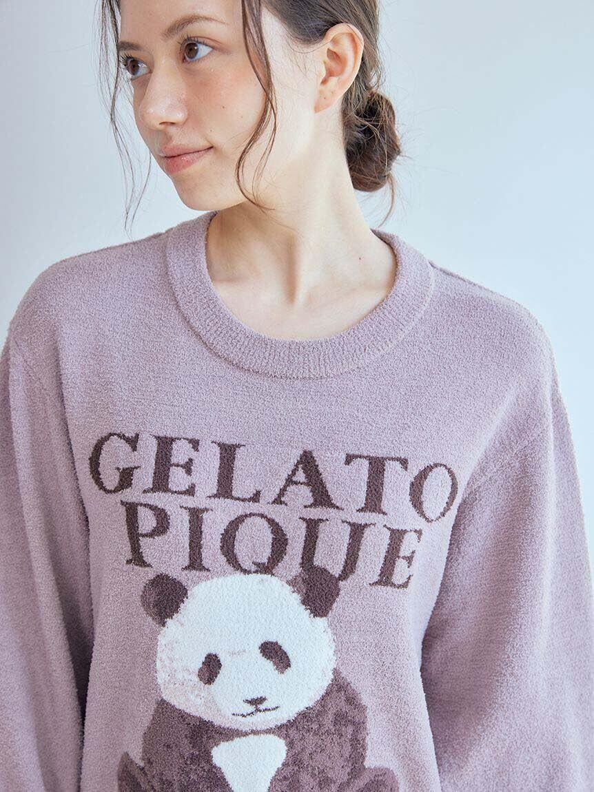 ほわんとした表情のパンダを、ブラウンとピンクの優しい色合いで表現したニットシリーズです。お座りしたパンダの脱力感がたまらないワンピースは、春に向けて重宝する薄手の`エアリーモコ'を使用。袖に程よい丸みを出した女の子らしいシルエットで、パンダ好き、可愛いもの好きな方におすすめのアイテムです。色はオフホワイトとピンク、ブラウンの3色をご用意しました。同シリーズのソックスやブランケットなど、小物との組み合わせもおすすめです。