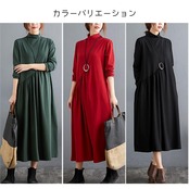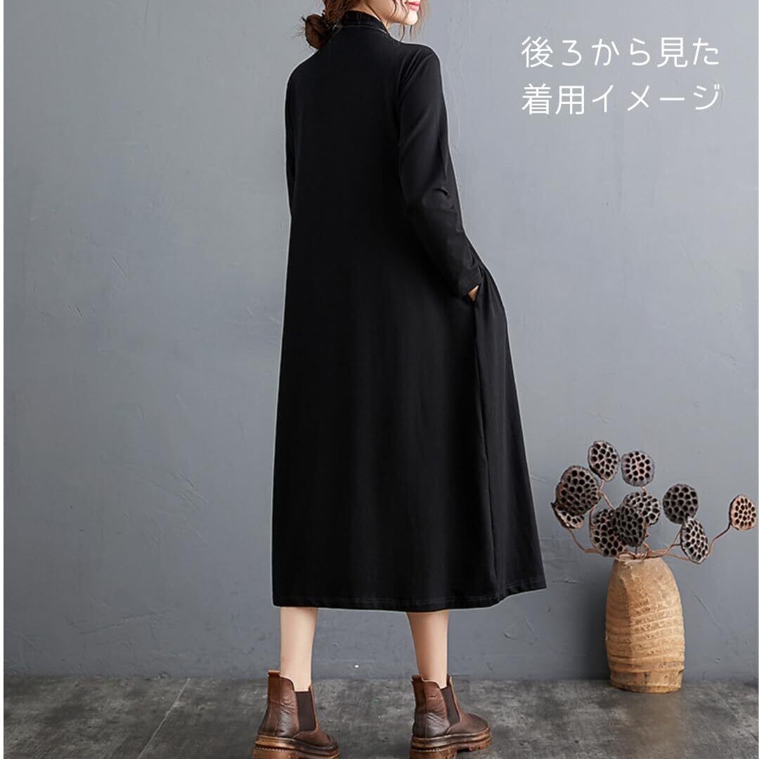 このワンピースは、ロングワンピースのフレア形状で着痩せ効果があり、体型をカバーできます。長袖のタートルネックデザインで、可愛らしさと暖かさを兼ね備えています。ふんわりとした素材感で、着心地が快適です。ゆったりとしたシルエットで、普段着としても活躍します。大きいサイズも取り揃えており、様々な体型の方におすすめです。少し肌寒い季節に最適です。