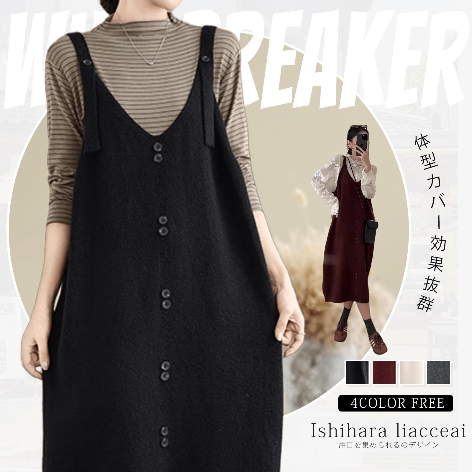 [Ishihara liacceai] サロペットスカート レディース ロング丈 vネック ニットワンピース オールインワン 重ね着 ジャンパー ノースリーブ ゆったり 無地 通勤 春 秋 冬