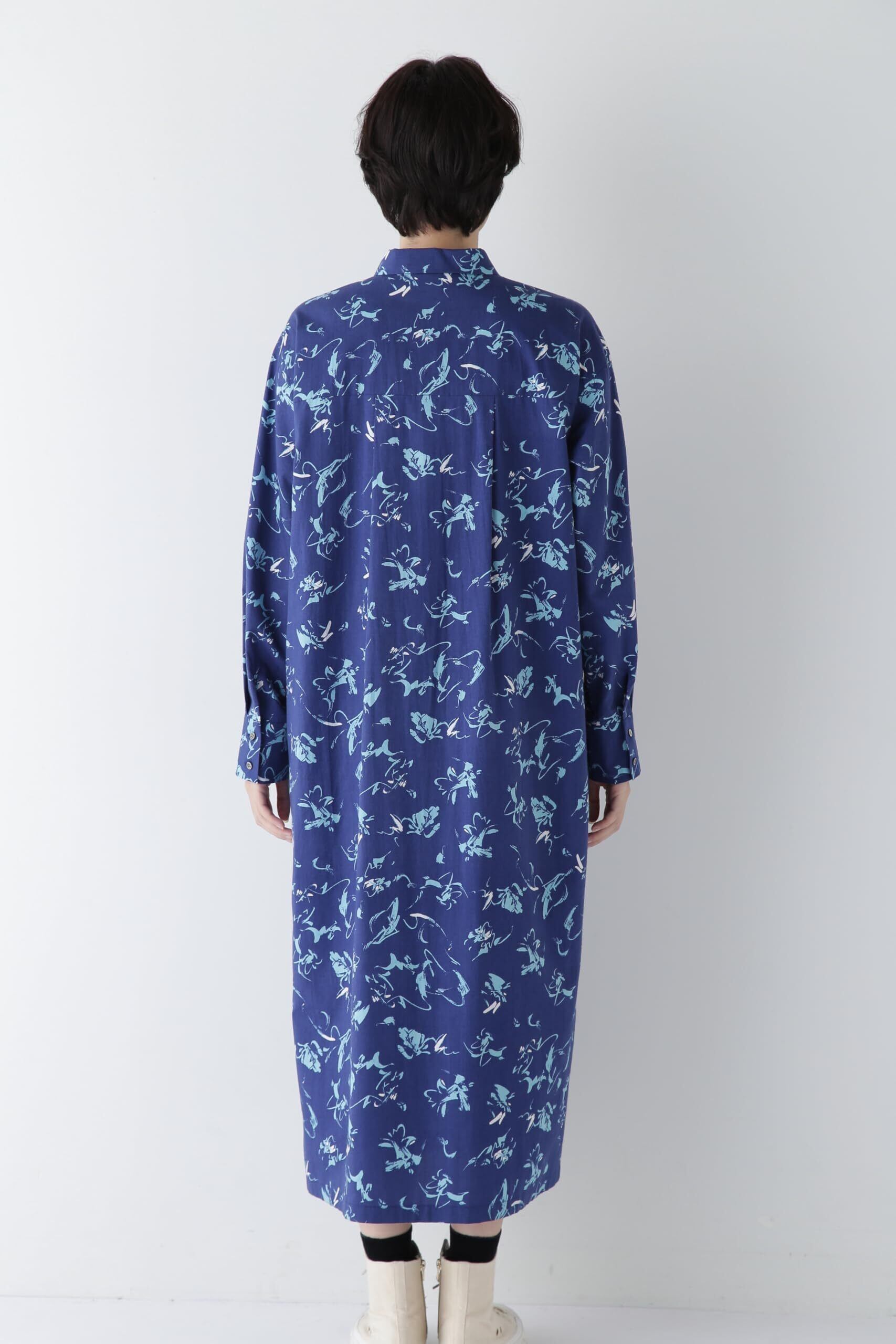 ■小さめの台衿付きシャツカラーがポイントの途中止まりあきプリントシャツワンピースです。