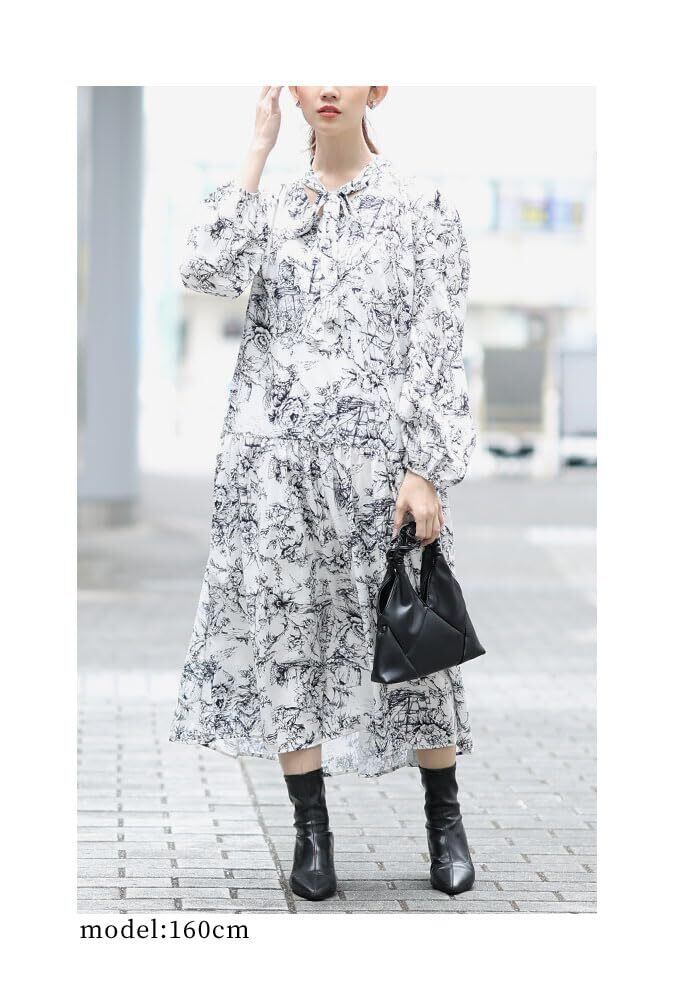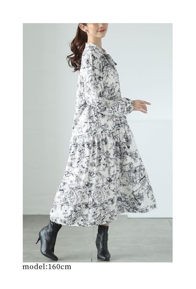 [sawa á la mode] 線画 で 描いた 風景画 が 美しい ボウタイ リボン ティアード ワンピース レディース ファッション ワンピース ドレス 大人可愛い