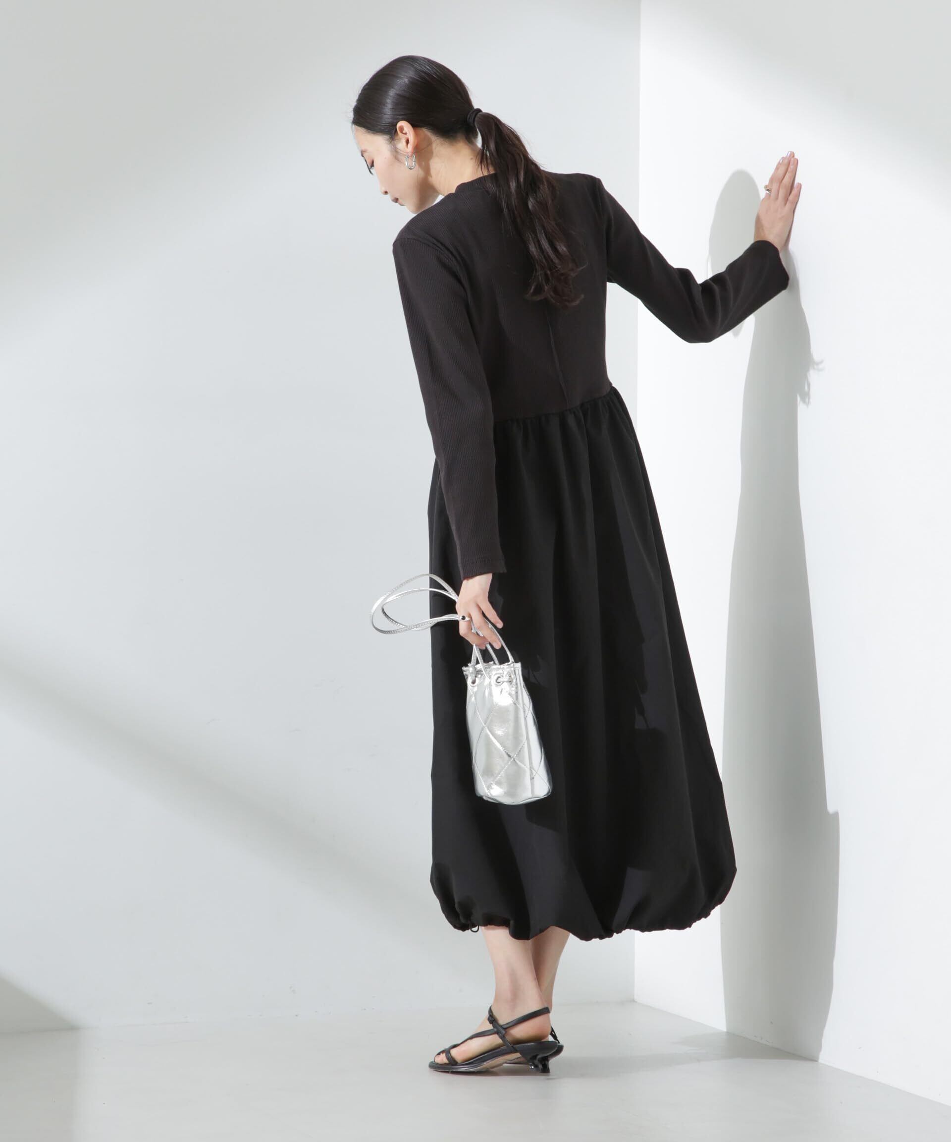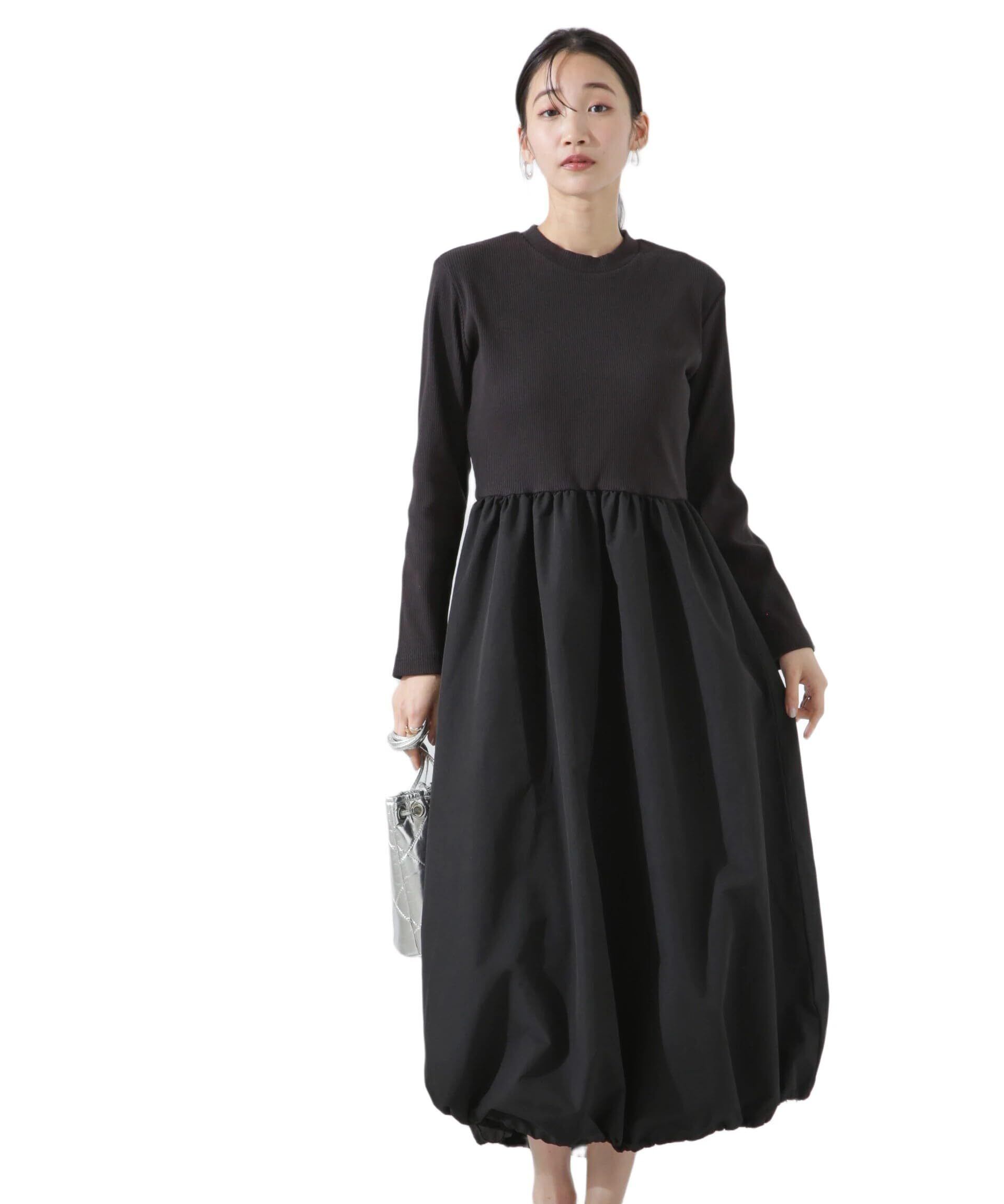 華やかな印象で楽ちんな着心地のコンビワンピース。スカート部分の裾にはスピンドルを通しているので、絞ることでバルーンシルエットにチェンジできる2WAYアイテム。ウエスト部分で切り替えを施した一枚でサマになるひと品です。