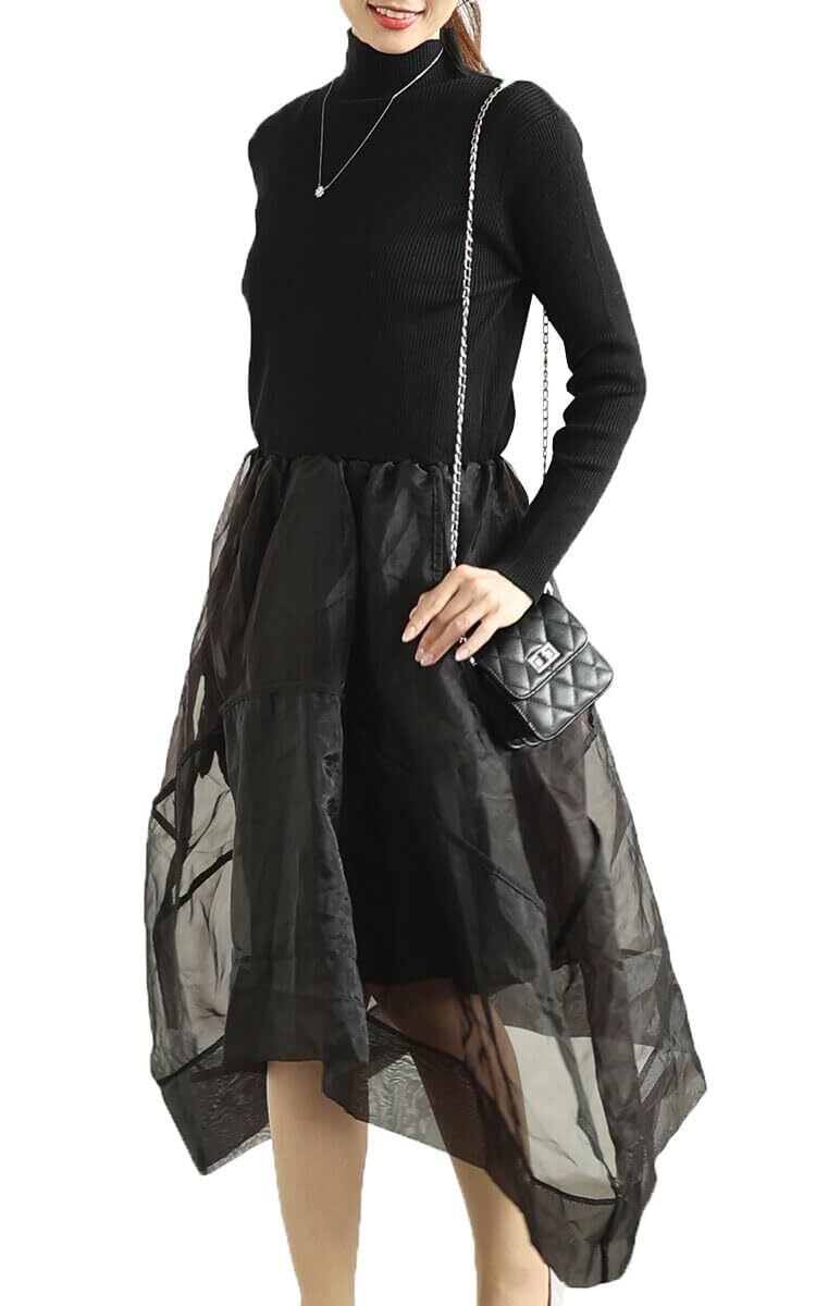 【在庫セール】[sawa á la mode] モード に 華やぐ ニット 切り替え アシンメトリー オーガンジー ワンピース レディース ファッション ワンピース ドレス 冬 大人可愛い | BOSSO