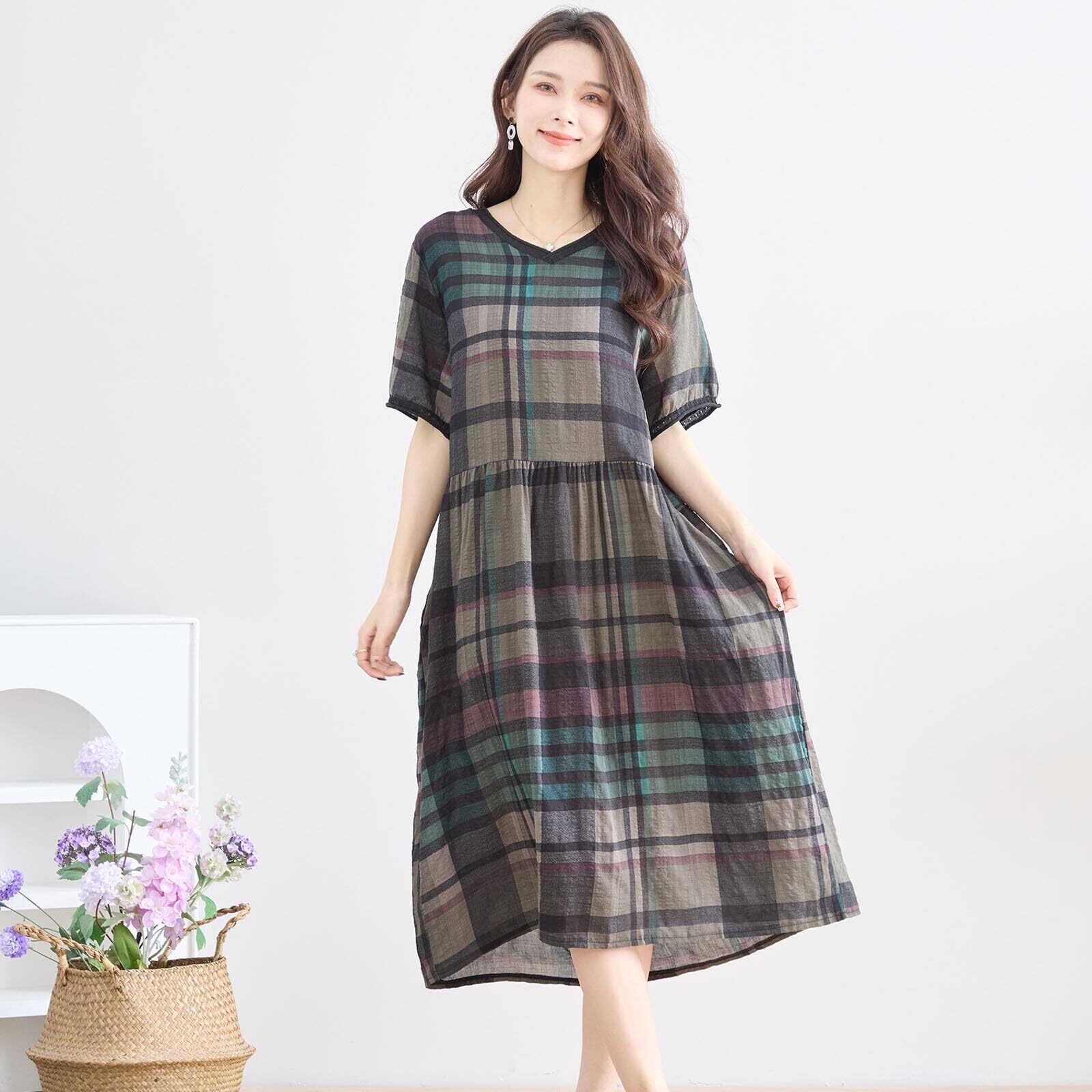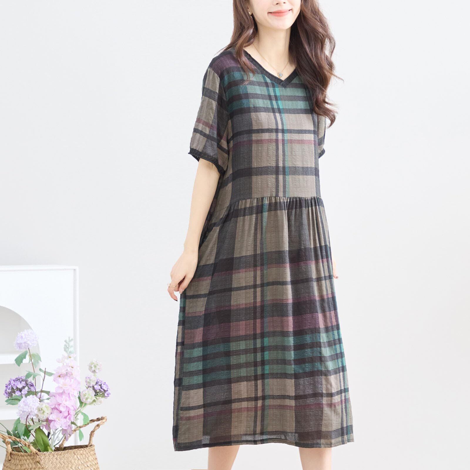 [pure&fine] ワンピース レディース チェック柄 コットン フレアー ナチュラル 体型カバー ロング 30代 40代 50代 60代 s3771