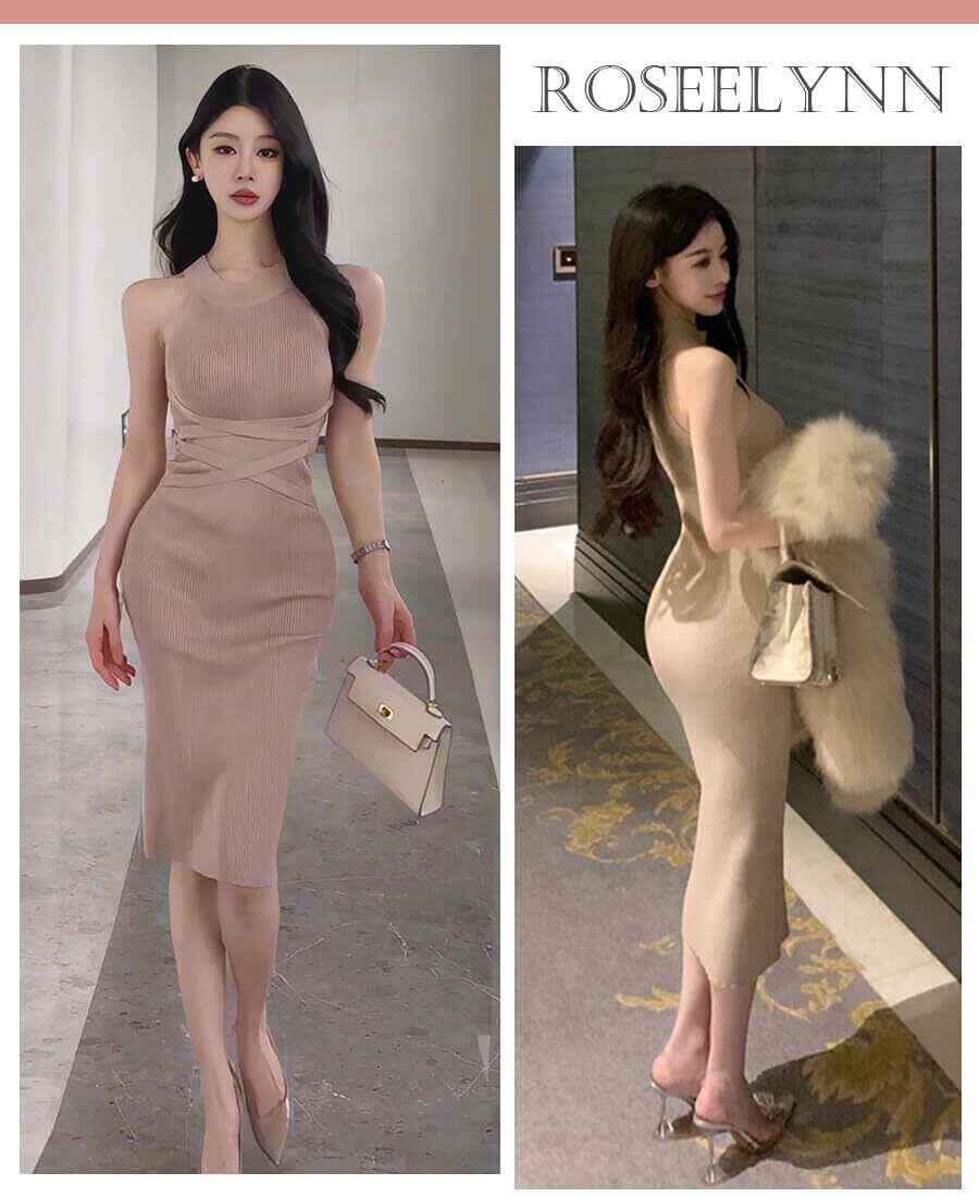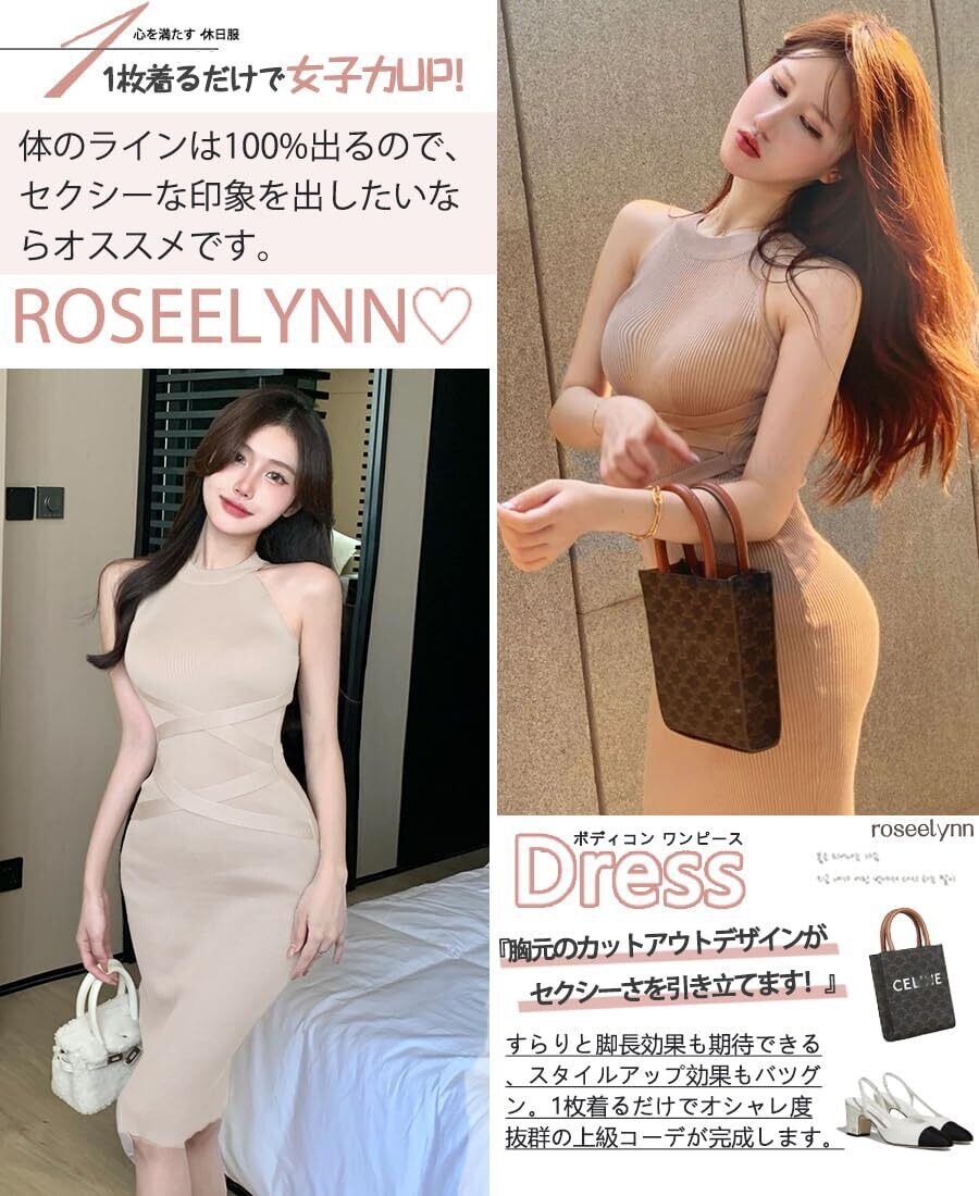 [Roseelynn] タイトワンピース セクシー ワンピース レディース 春 夏 ニット 胸強調 胸元 ワンピース ノースリーブ デート
