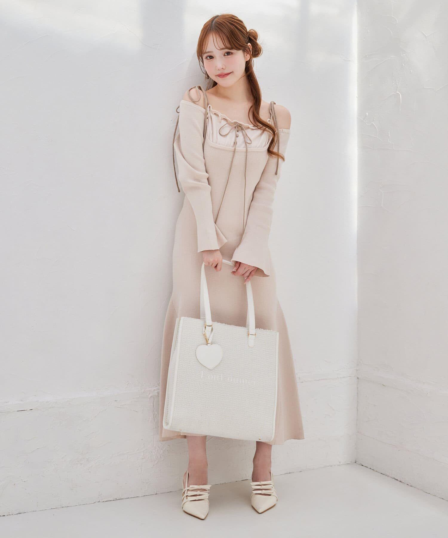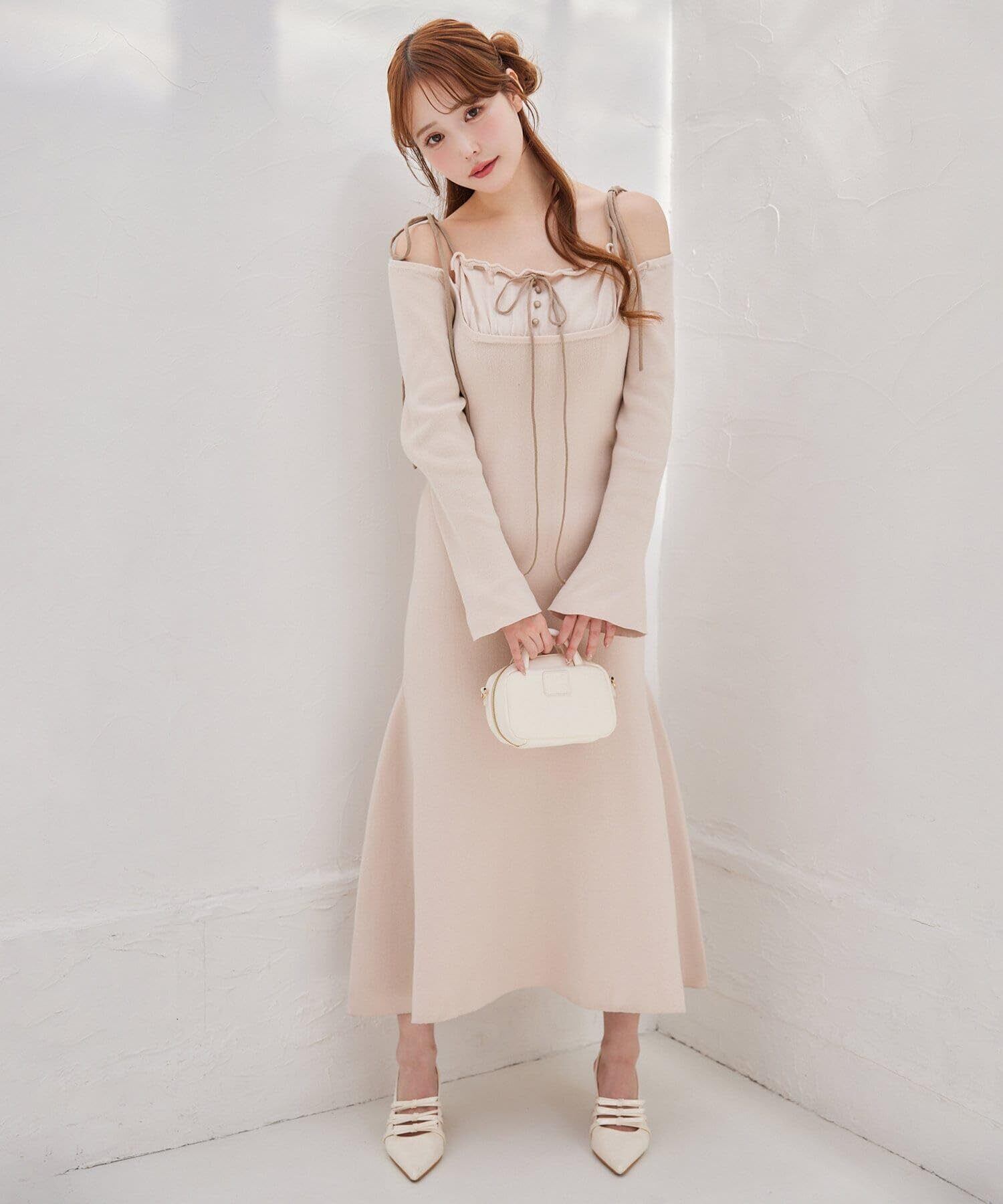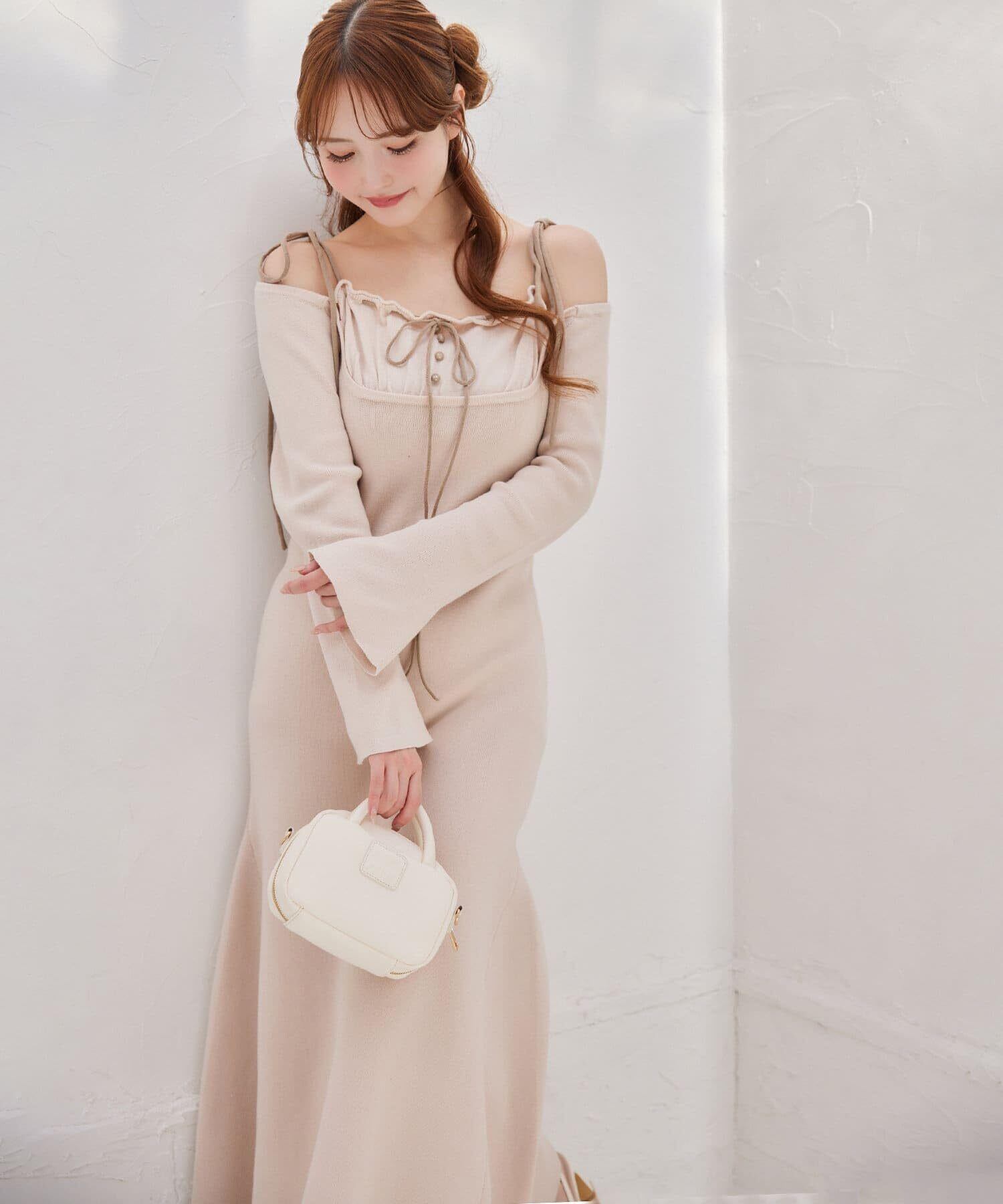 1枚でレイヤードしているようにも見えるワンピース 伸縮性の良いリブ素材で着心地も抜群。 シルエットは身体のラインがきれいに出るマーメイドデザインで 女性らしい上品な印象になります◎ 肩のリボンがシンプルなデザインの中に甘さをプラスしてくれます。