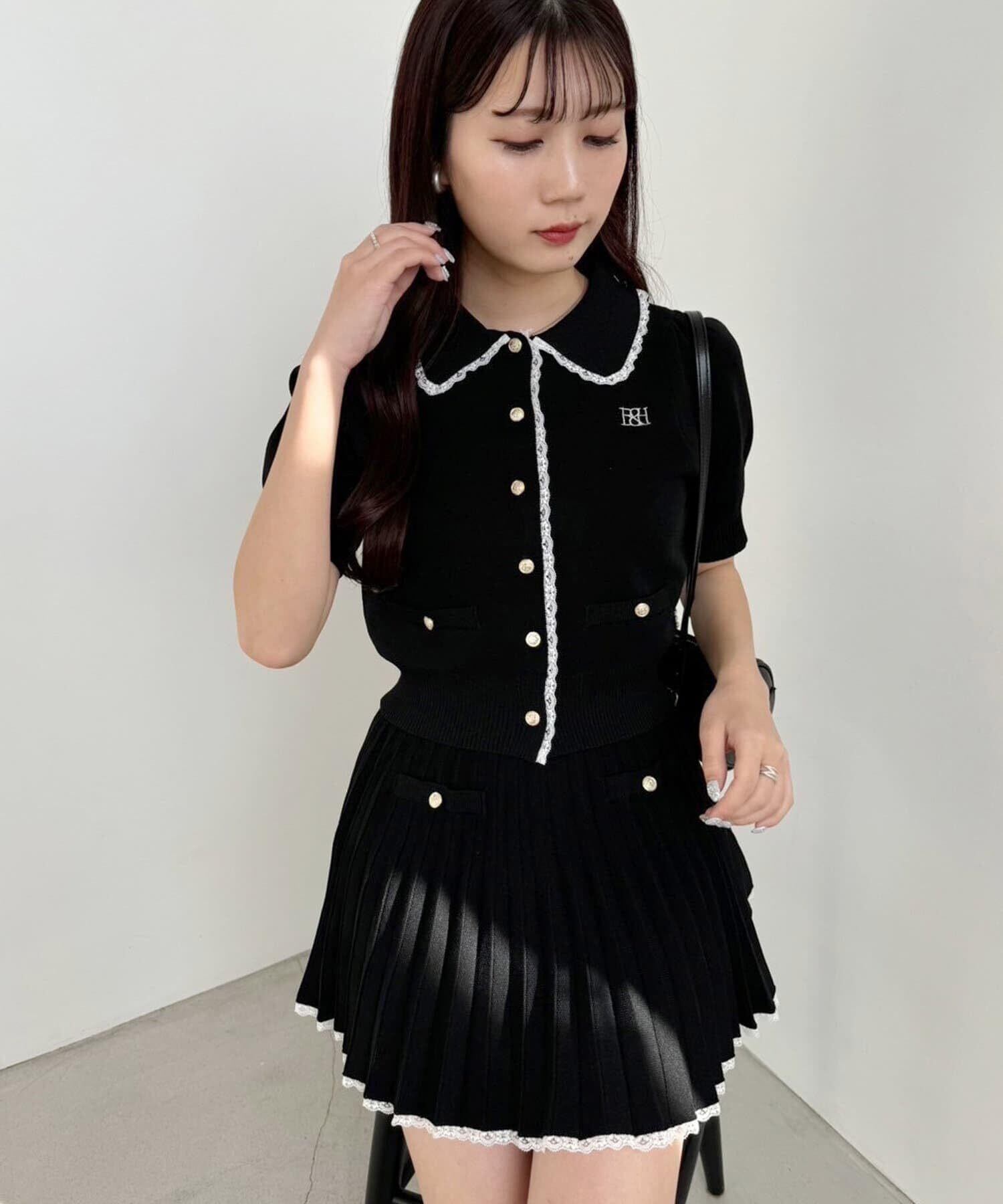 大人気だったセットアップが半袖になって登場。。 ロゴがポイントのニットとプリーツスカートのセットアップです。 襟元の刺繍やボタンのディテールが高級感をプラスし、 特別感のあるデザインに仕上がっています