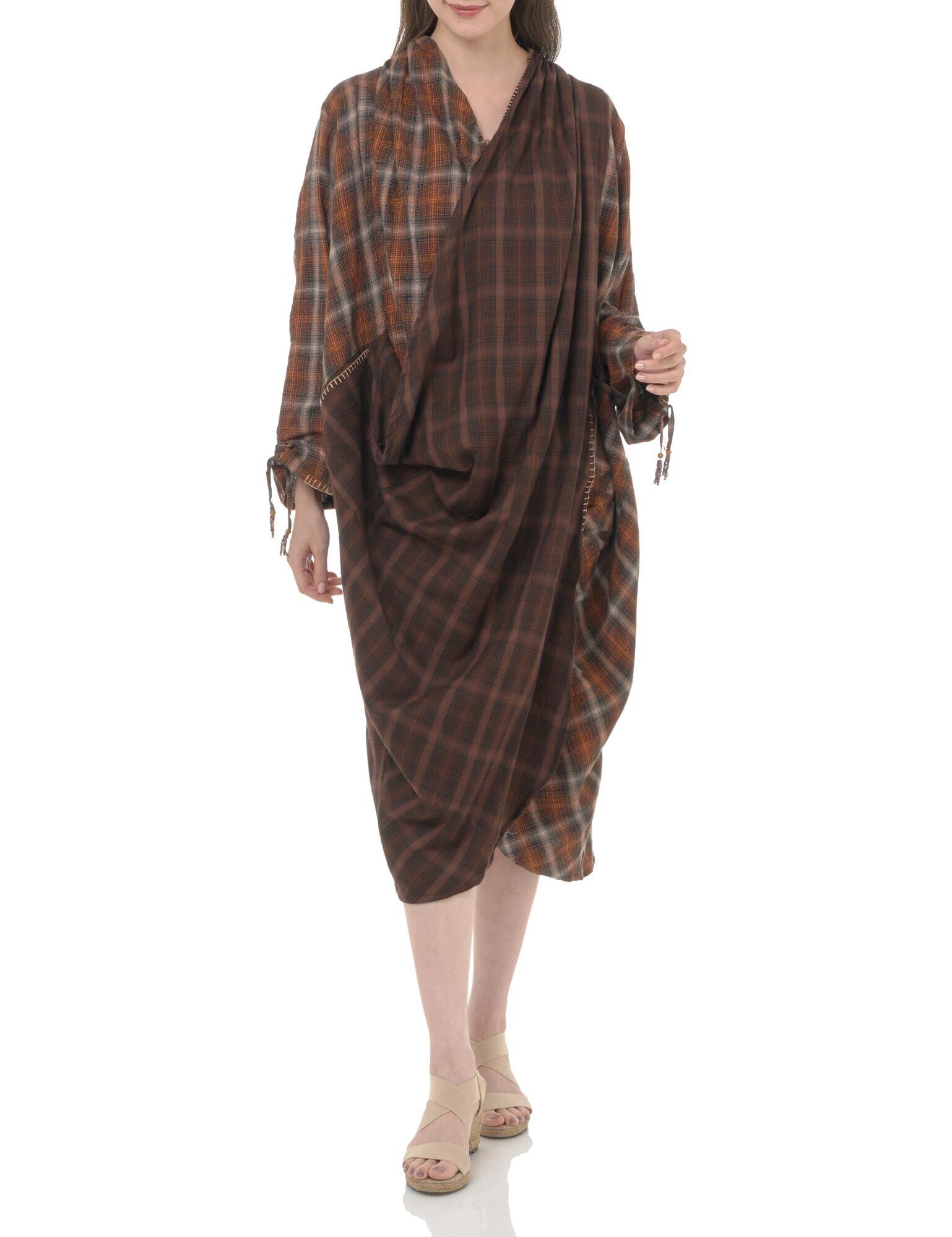 ラジャスタンの力強いカラーリングから着想を得たチェック柄ワンピース。ブランケットステッチやジグザグのステッチがポイントのアイテム。インドのドーティパンツや僧侶のドレープから着想した、大胆なデザイン。レイヤードすれば存在感抜群のスタイリングにもなる。