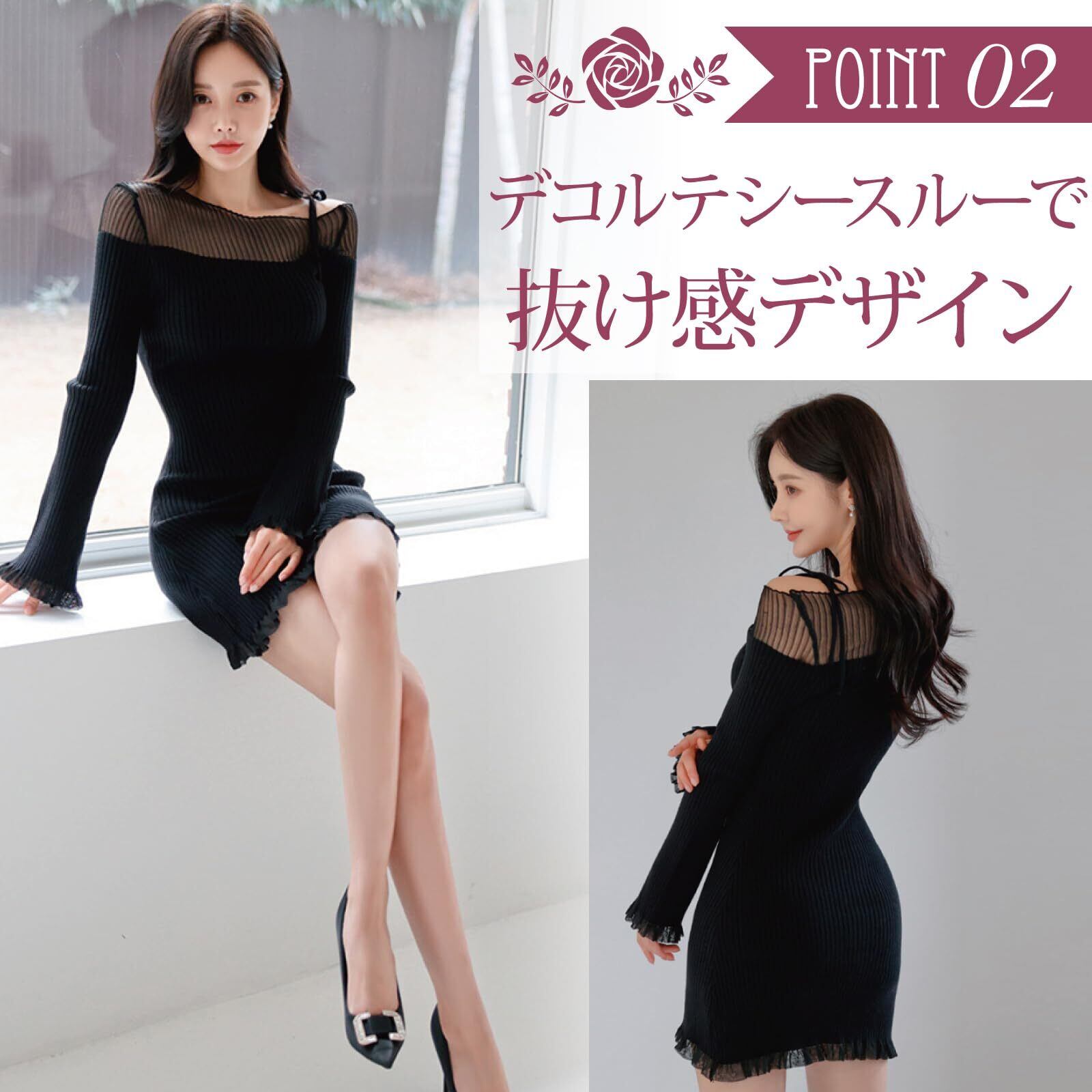 シースルーネックニットワンピース(キャバドレス・CABARETDRESS)。身体にフィットするニット素材が女性らしいボディラインを生み出し、デコルテをシースルーにすることで抜け感あるデザインに。さりげないベルスリーブで華奢魅せしながら所作も美しく魅せ、小さなフリルが可愛らしいワンピースです。