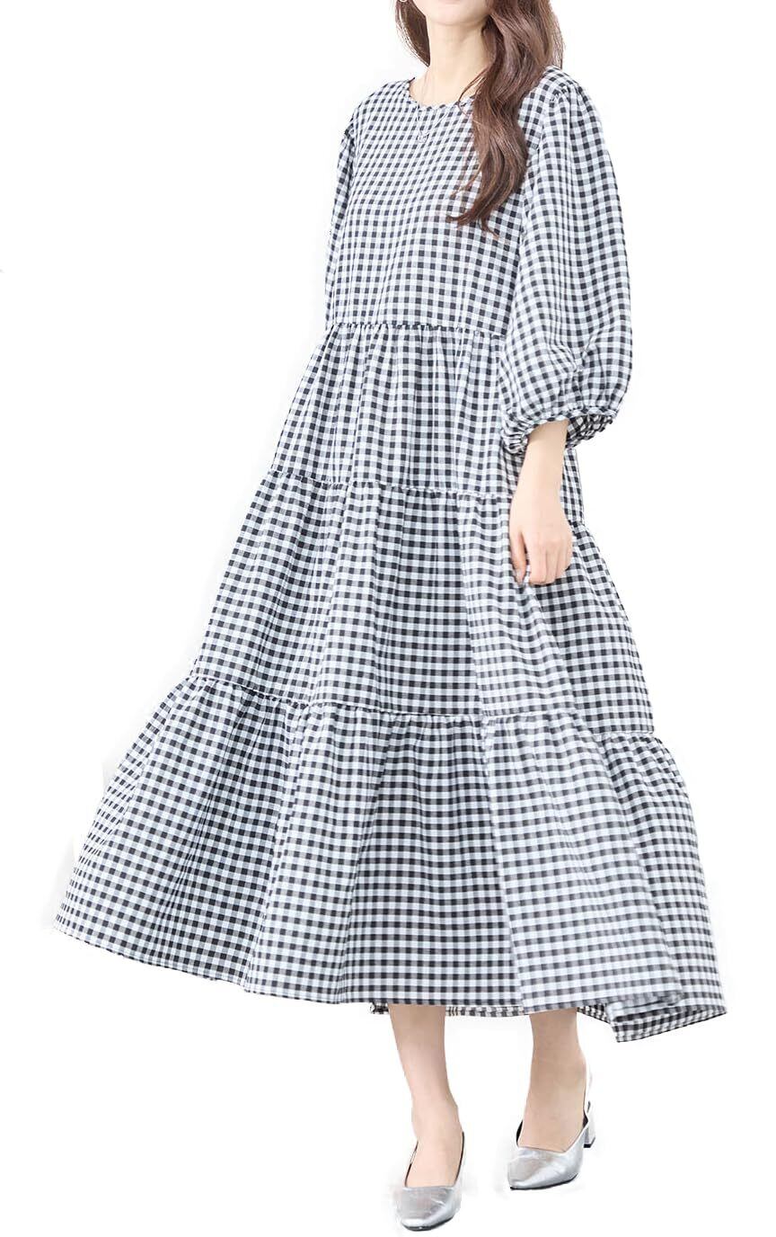 [pure&fine] ワンピース ふっくら袖 ティアード ギンガムチェック ゆったり 大きい 40代 50代 体型カバー z3622