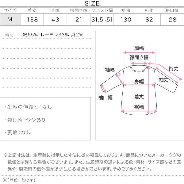 着丈 138、身幅 43、襟開き幅 21、ウエスト幅 31.5-51、裾幅 130、裄丈 82、袖口幅 28