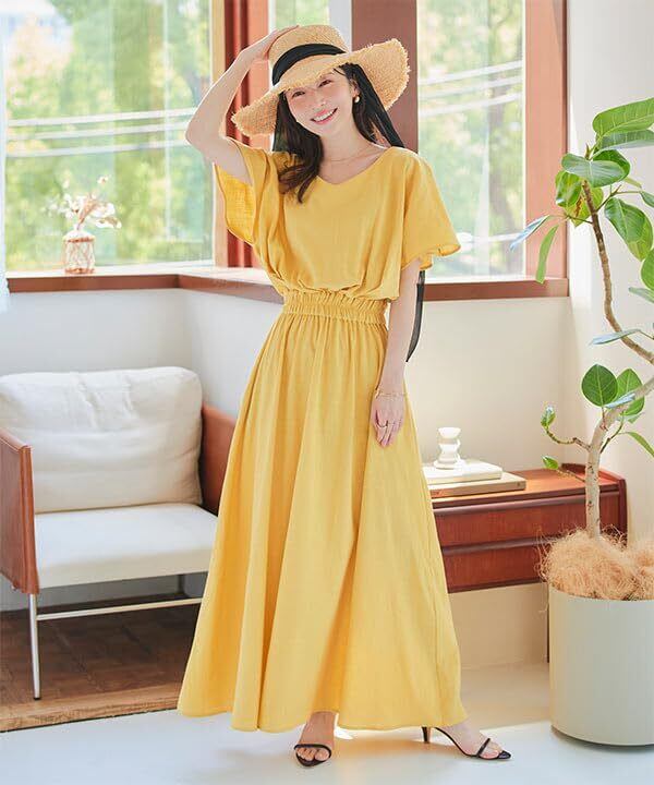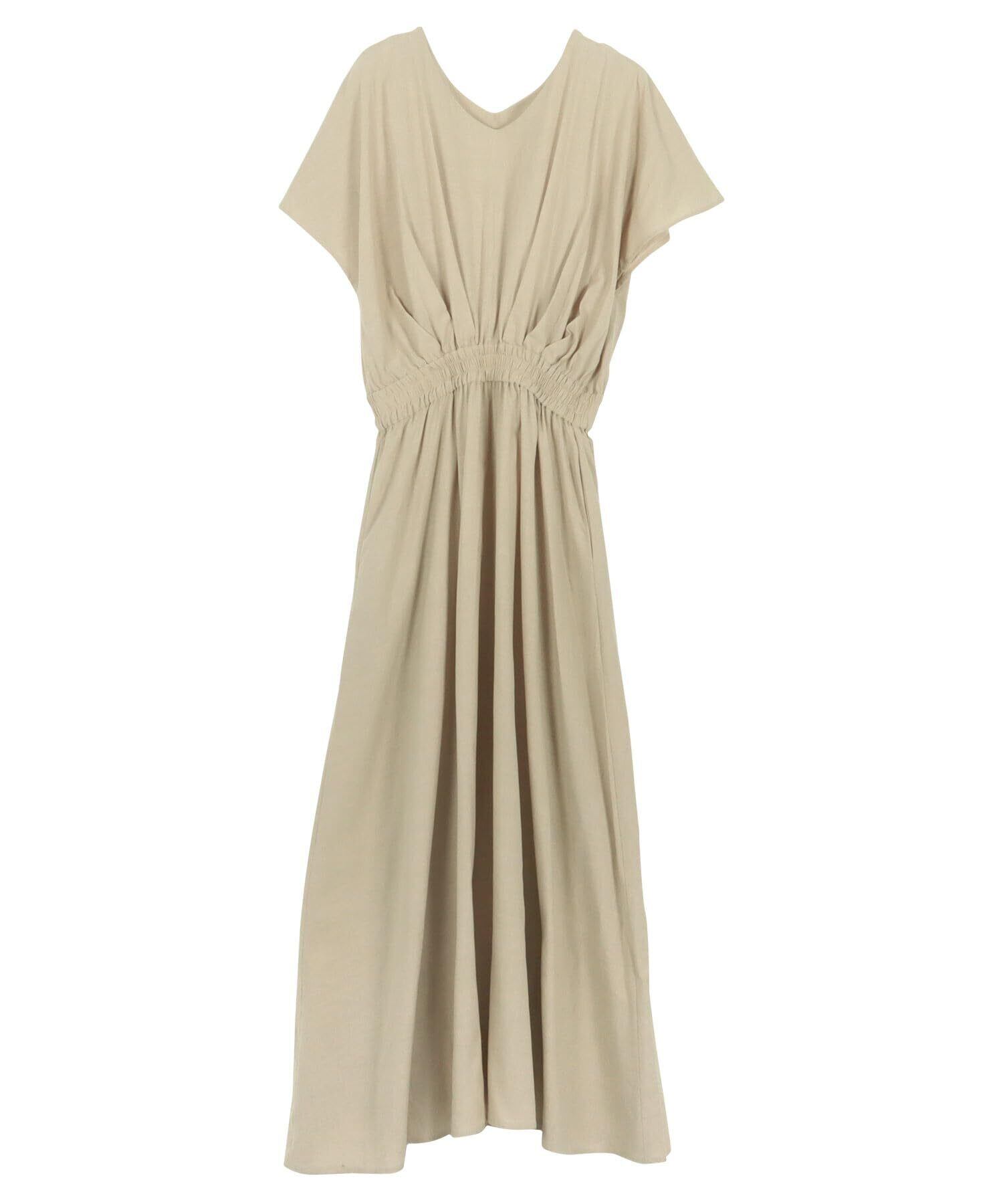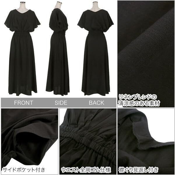 [神戸レタス] リネンタッチ ウエストブラウジングワンピース マキシ丈 リゾート 旅行 ワンピース 半袖 夏 [E3403]