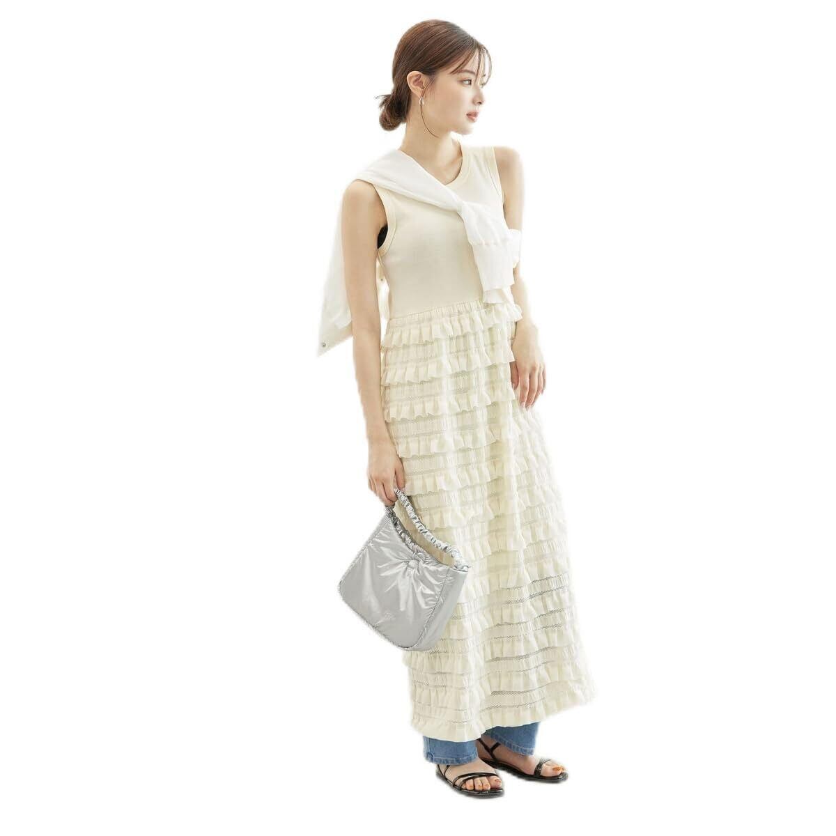 素材感 : テレコ素材のトップスとフリル素材をドッキングさせたワンピース。