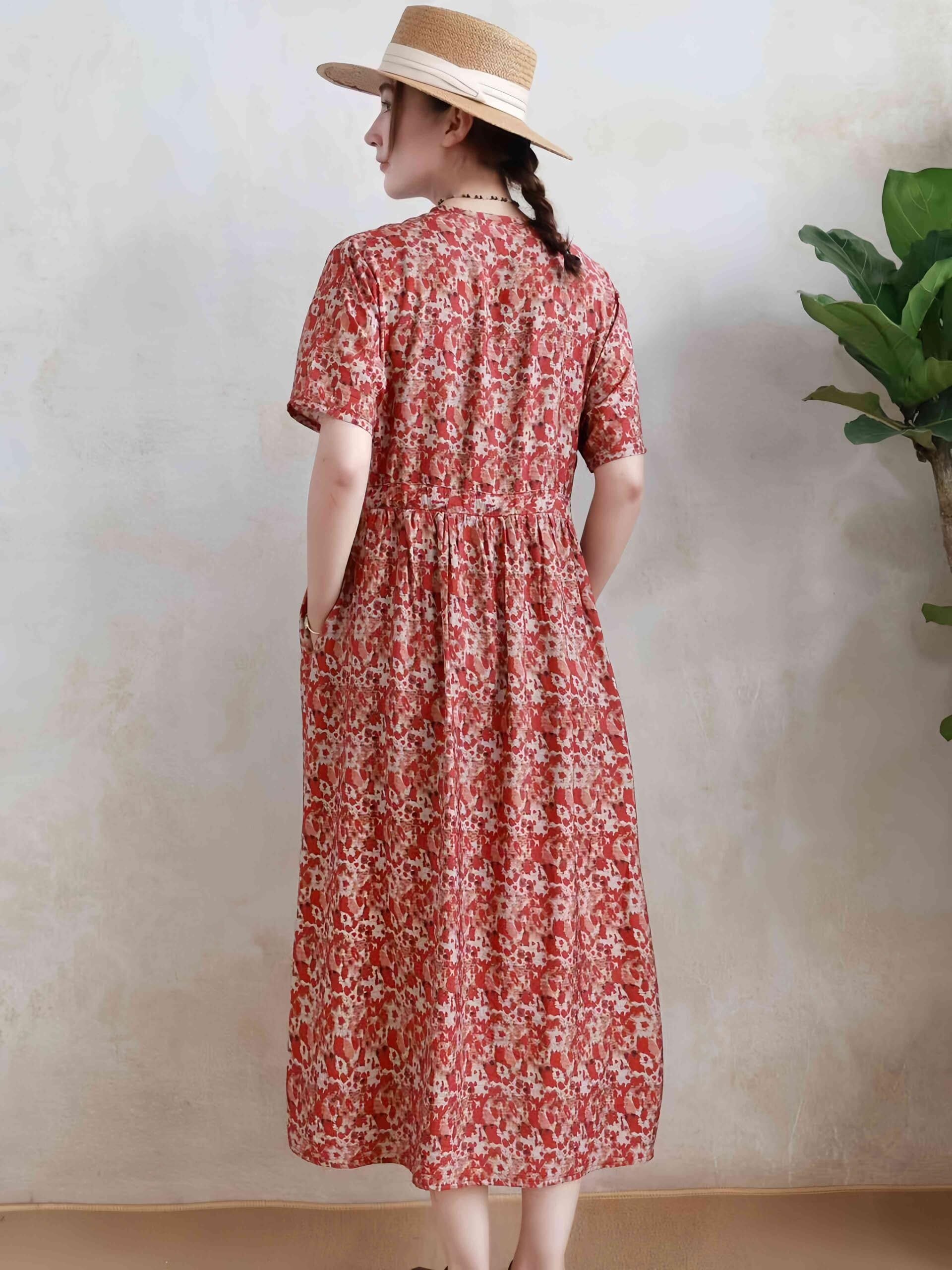 [JIAONASHIJIA] 夏 ドレス クルーネック 体型カバー 半袖 ワンピース 花柄 レディース 綿麻 ひざ丈 フラワー 可愛い 大きいサイズ 柔らかい 普段着 カジュアル ゆったり エレガント フリーサイズ