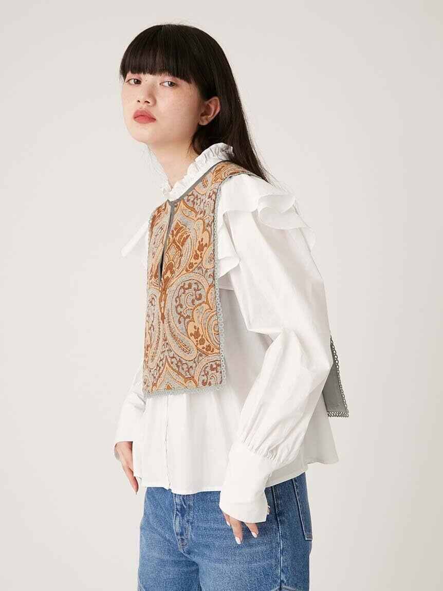 シンプルなアイテムへのプラスワンでコーディネートが格上げされるアタッチドカラー。今季は定番のジャガードに加え、ボンディングレースを加えたバリエーションで展開します。端はスカラップのレーステープで縁取り、バックスタイルのリボンでフェミニンに仕上げました。ジャガードの柄を同色系でまとめることで、着回しやすさもアップデートしています。