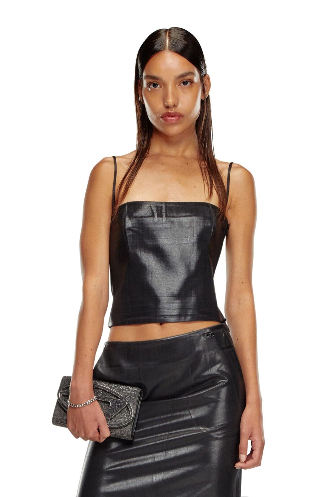 ミックスマテリアルのレーサーバックトップ。光沢のあるフェイクレザーとクラシカルなピンストライプの生地を組み合わせた一枚です。スパゲティストラップを採用することで華奢な雰囲気が生まれ、女性らしい表情も。左上にはオーバルDのメタルロゴを添え、クールなアクセントにしました。ストラップは長さ調節可能、サイドコンシールジッパー仕様です。